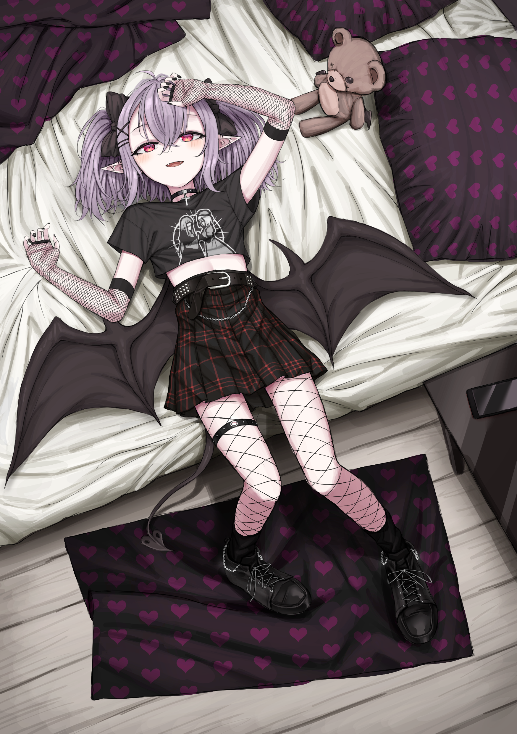 1girl :d absurdres bed bedroom belt black_choker black_footwear black_shirt borrowed_character cellphone choker commission crop_top cropped_shirt cross cross_choker demon_girl demon_tail demon_wings elbow_gloves fangs fingerless_gloves fishnet_gloves fishnet_pantyhose fishnets flat_chest gloves goth_fashion heart heart_print high-waist_skirt highres indoors light_purple_hair lobsteranian lying medium_hair on_back on_bed open_mouth original pantyhose phone pillow plaid_clothes plaid_skirt pleated_skirt pointy_ears red_eyes rika_roseingrave shirt short_sleeves skirt smartphone smile stuffed_animal stuffed_toy tail teddy_bear thigh_strap two_side_up wings