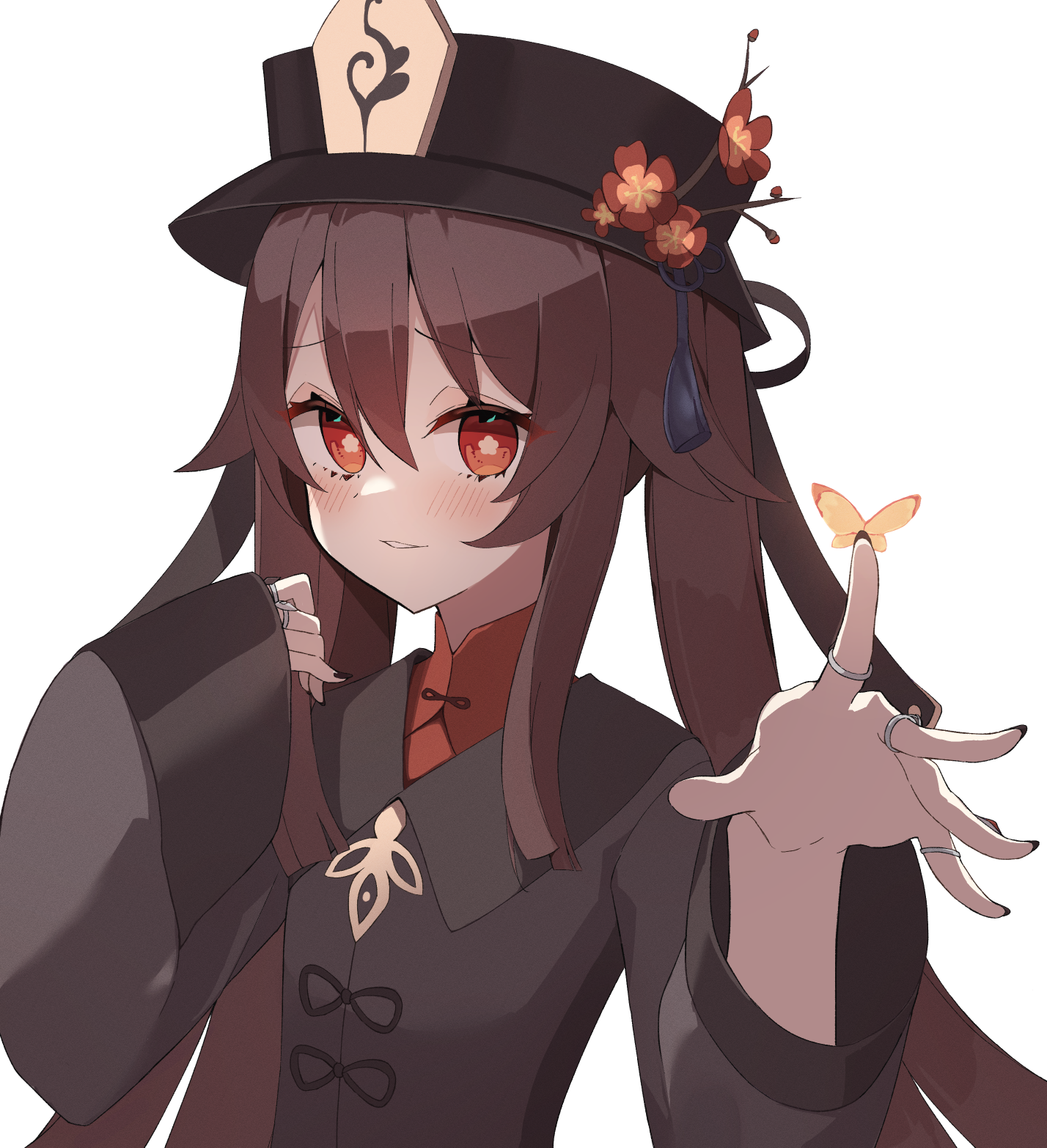 1girl black_jacket black_nails brown_hair bug butterfly genshin_impact hat highres hu_tao_(genshin_impact) insect jacket looking_at_viewer orange_eyes red_shirt sasai_nakoto shirt simple_background white_background