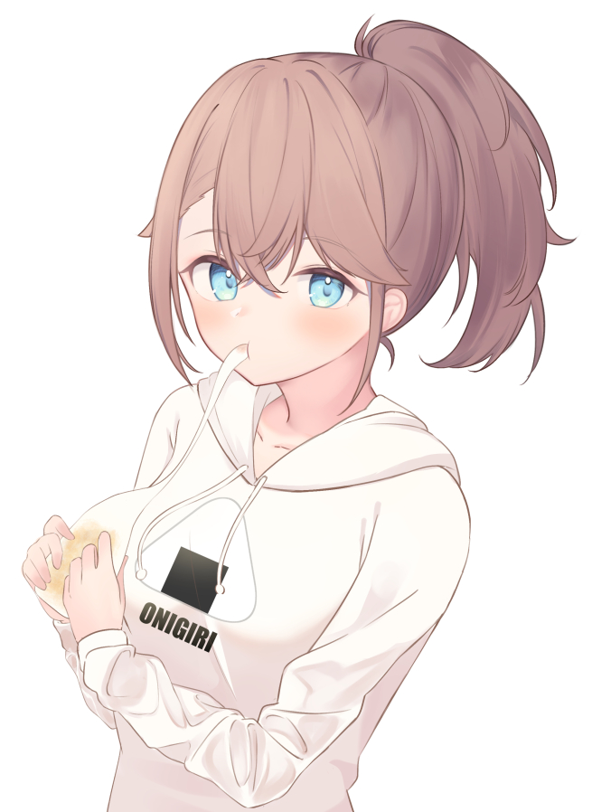 1girl blue_eyes breasts brown_hair clothes_writing commentary_request eating food food_print hair_between_eyes holding holding_food hood hood_down hoodie long_sleeves medium_breasts mochi onigiri_print original ponytail roido_(taniko-t-1218) simple_background sleeves_past_wrists solo upper_body white_background white_hoodie