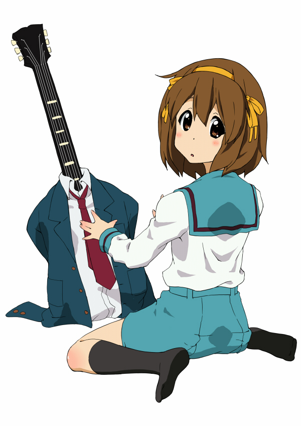 1girl alternate_costume black_socks blazer blue_sailor_collar blue_skirt blush brown_eyes brown_hair collared_shirt commentary_request company_connection cosplay electric_guitar from_behind full_body green_jacket guitar hair_ornament hairclip hirasawa_yui instrument jacket k-on! kita_high_school_uniform kneehighs long_sleeves looking_at_viewer looking_back necktie parody parted_lips pleated_skirt red_necktie sailor_collar school_uniform serafuku shirt short_hair simple_background sitting skirt socks solo suzumiya_haruhi suzumiya_haruhi_(cosplay) suzumiya_haruhi_no_yuuutsu uguisu_(happy_turn) white_background white_shirt winter_uniform