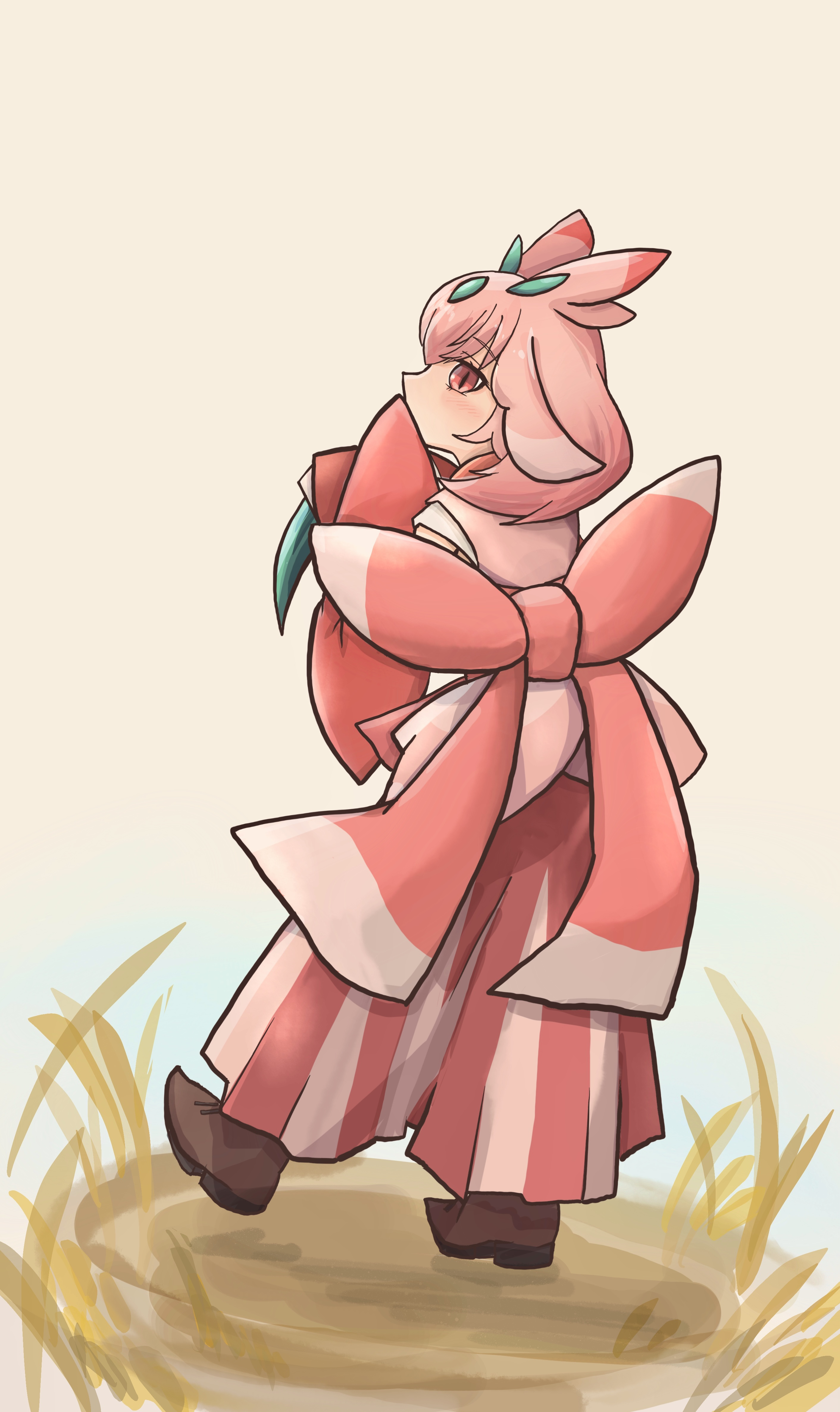 1girl absurdres back_bow blush bow brown_shoes detached_sleeves female_focus from_behind full_body gen_7_pokemon grass hair_ornament hakama hakama_pants hands_up highres humanization japanese_clothes kimono leg_up looking_at_viewer looking_back lurantis medium_hair namakura_g nintendo pants pink_bow pink_hair pink_hakama pink_kimono pointy_shoes pokemon red_eyes shoes sidelocks simple_background sleeveless sleeveless_kimono sleeves_past_fingers sleeves_past_wrists slit_pupils solo standing standing_on_one_leg yellow_background