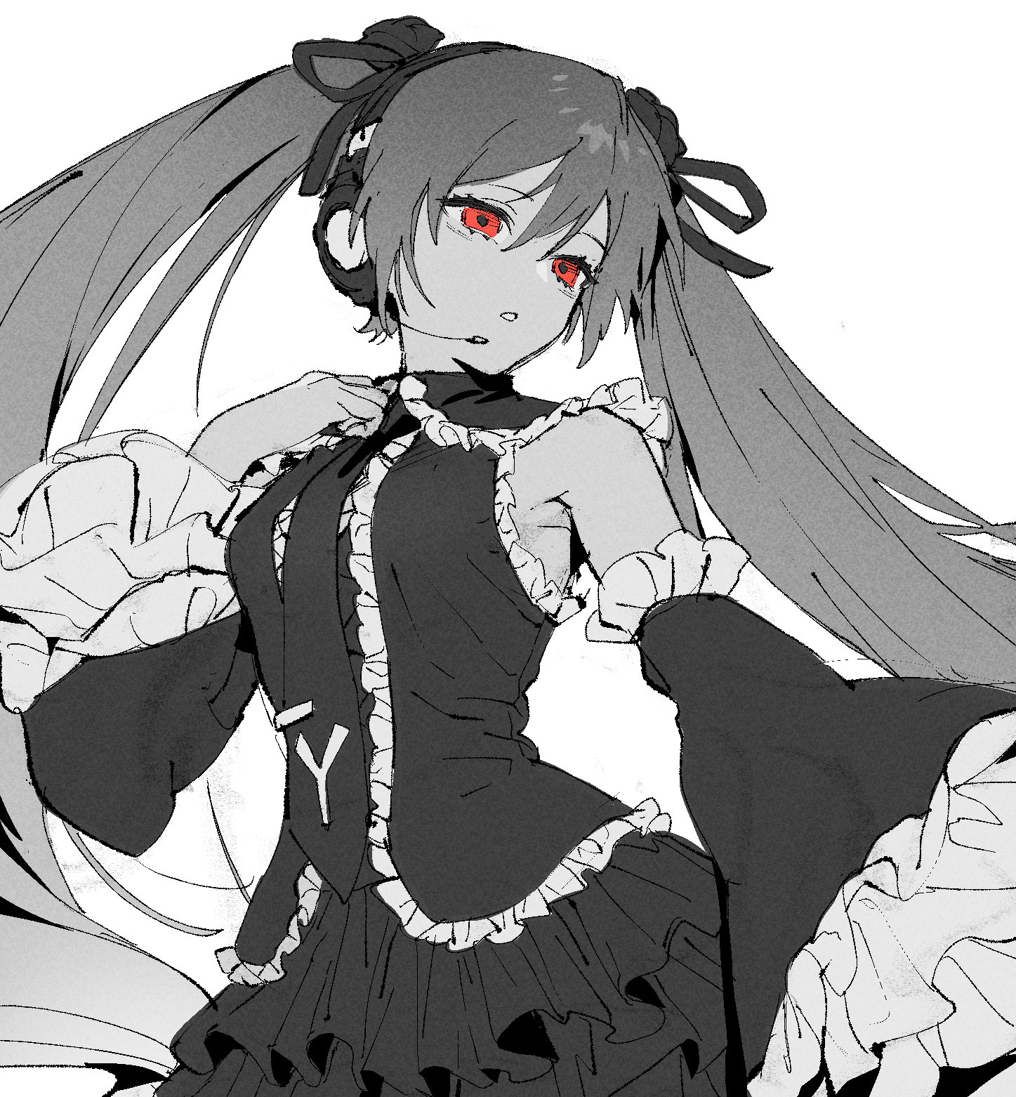 1girl goth_fashion hatsune_miku hatsune_miku_no_gekishou_(vocaloid) highres hatsune_miku_(infinity) microphone monochrome red_eyes solo souitiroukirari twintails vocaloid