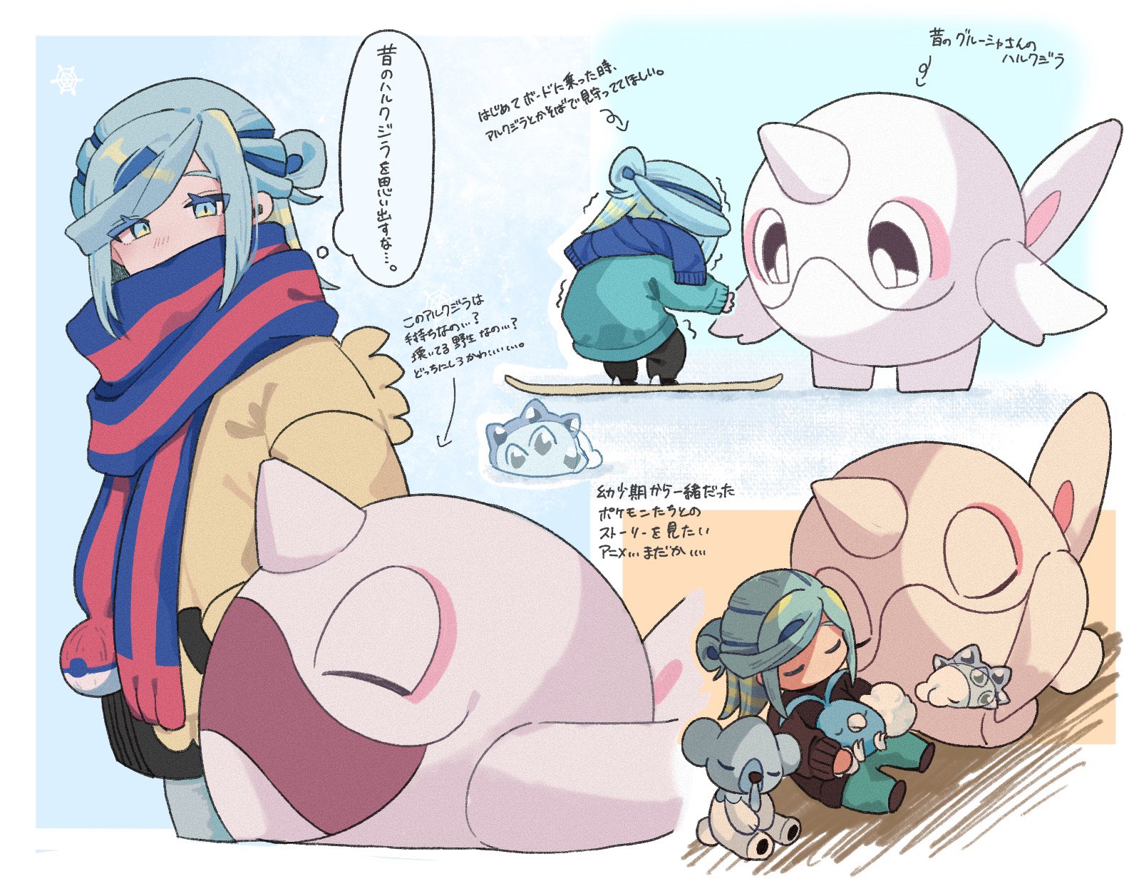 1boy 217_shion_407 androgynous black_sweater blue_eyes blue_hair blue_mittens blue_scarf cetoddle closed_eyes cubchoo gen_3_pokemon gen_5_pokemon gen_8_pokemon grusha_(pokemon) highres holding holding_pokemon jacket long_hair long_sleeves mittens nintendo pants pokemon pokemon_(creature) pokemon_scarlet_and_violet scarf scarf_over_mouth sleeping snom snowboard snowboarding striped_clothes striped_scarf swablu sweater yellow_jacket