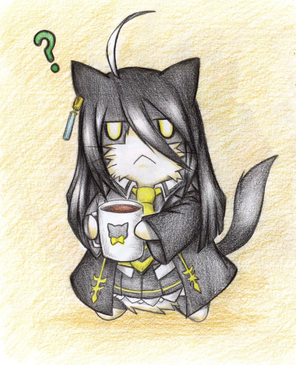 :< ? ahoge animalization black_coat black_hair black_skirt cat coat coffee coffee_mug colored_pencil_(medium) commentary cup earrings hair_between_eyes highres holding holding_cup huge_ahoge jewelry jitome long_bangs long_hair looking_at_viewer manhattan_cafe_(umamusume) mug necktie neko_kyo no_humans pleated_skirt single_earring skirt standing traditional_media umamusume white_hair yellow_eyes yellow_necktie