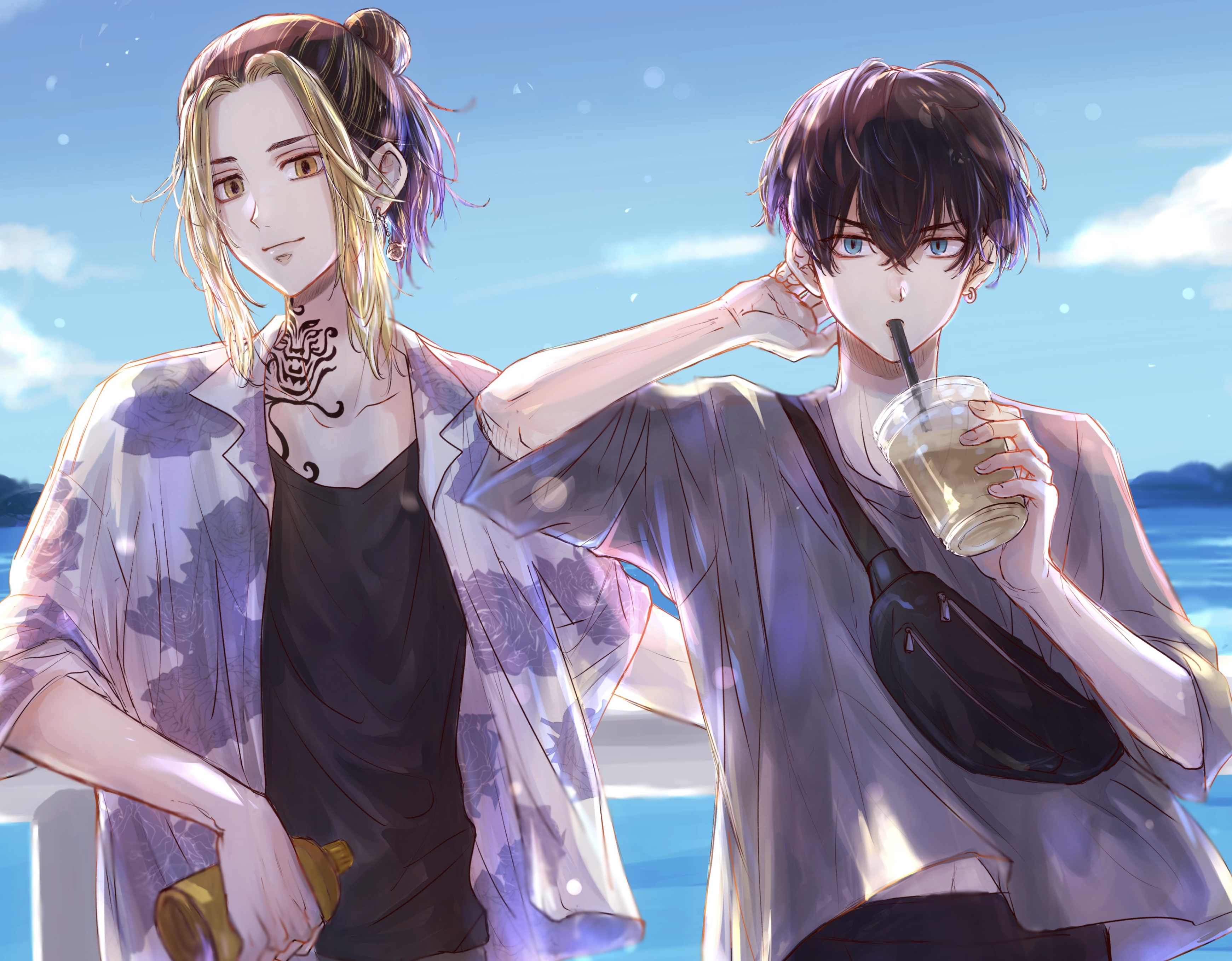 2boys absurdres arm_up bag bell black_hair black_pants black_shirt blonde_hair blue_eyes bottle closed_mouth collarbone cowboy_shot cup day drinking_straw drinking_straw_in_mouth earrings grey_shirt hair_between_eyes hair_bun hair_pulled_back hanemiya_kazutora highres holding holding_bottle holding_cup jewelry male_focus matsuno_chifuyu medium_hair multicolored_hair multiple_boys neck_tattoo outdoors pants razu_re0824 shirt short_hair short_sleeves shoulder_bag single_earring smile standing tattoo tokyo_revengers two-tone_hair yellow_eyes