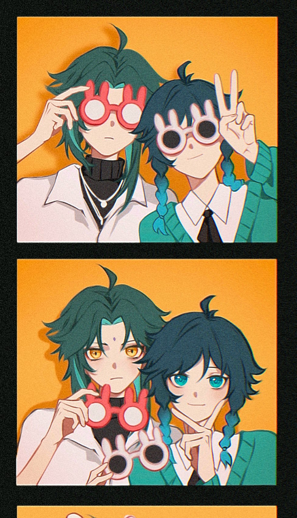 2boys ahoge alternate_costume antenna_hair arm_up black_border black_necktie black_sweater blue_eyes blue_hair border braid closed_mouth collared_jacket collared_shirt comic commentary genshin_impact glasses gradient_hair green_hair green_sweater hair_between_eyes hair_ornament hand_on_own_face hand_up hands_up highres jacket jewelry long_sleeves looking_at_viewer male_focus multicolored_hair multiple_boys necklace necktie orange_background parted_bangs puffy_long_sleeves puffy_sleeves shadow shirt short_hair simple_background smile standing sunglasses sweater untranslatable_commentary turtleneck turtleneck_sweater twin_braids two-tone_hair unik0503 v v-shaped_eyebrows venti_(genshin_impact) white_jacket white_shirt xiao_(genshin_impact) yellow_eyes