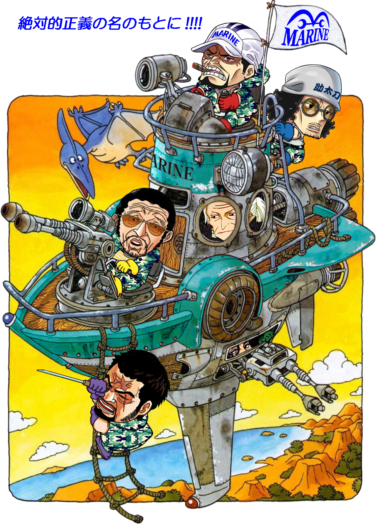 1girl 5boys aircraft airship aokiji_(one_piece) beard black_hair chibi cigar cloud english_text facial_hair flag fujitora_(one_piece) gloves highres holding holding_sword holding_weapon kizaru_(one_piece) lake mountain multiple_boys mustache old old_woman one_piece orange-tinted_eyewear orange_sky ponytail pterosaur purple_gloves rope_ladder round_eyewear ryokugyu_(one_piece) saiten_daisho sakazuki_(one_piece) scar scar_across_eye scar_on_face short_hair sideburns sky sword teeth tinted_eyewear toriyama_akira_(style) tsuru_(one_piece) weapon white_hair