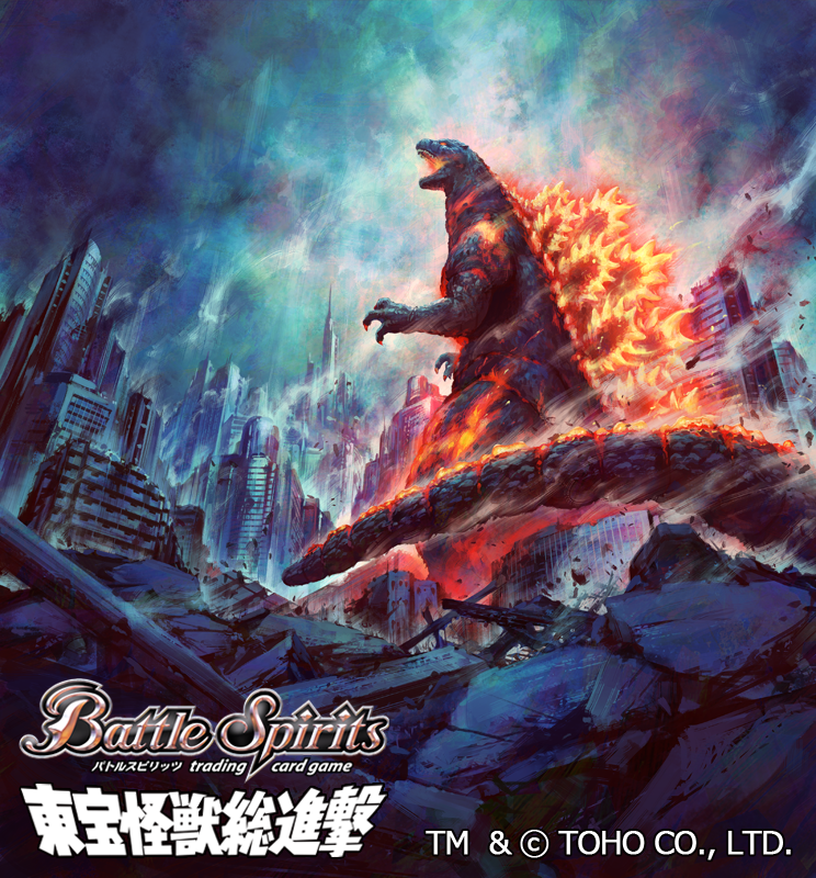 aura bandai battle_spirits building burning_godzilla city destruction dinosaur epic glowing glowing_eyes glowing_mouth glowing_spikes godzilla godzilla_(series) godzilla_vs._destoroyah kaiju nurikabe_(mictlan-tecuhtli) official_art skyscraper smoke spikes steam steaming_body tail toho