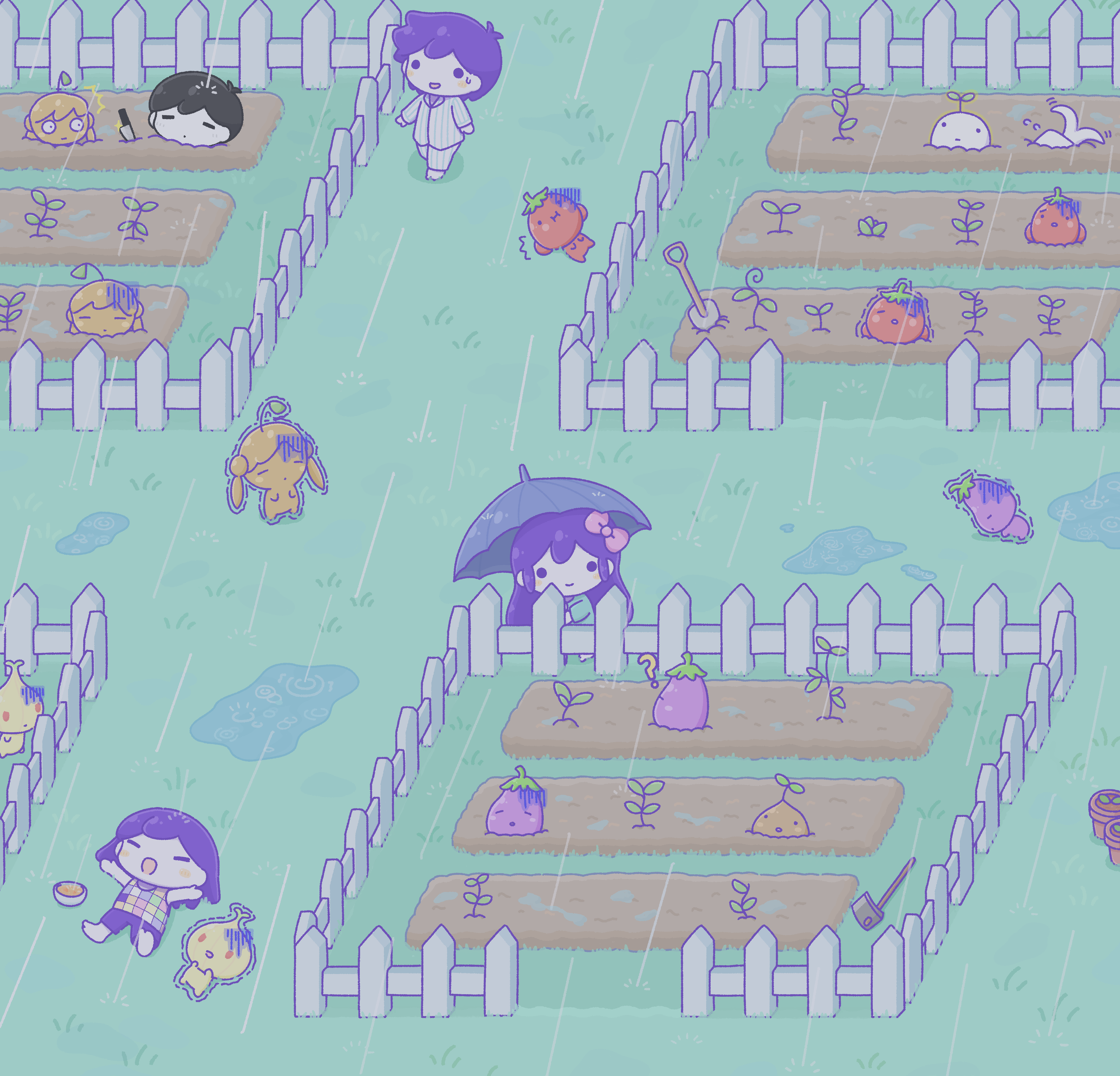 1girl 3boys absurdres aubrey_(headspace)_(omori) aubrey_(omori) barefoot black_hair bow chibi closed_eyes closed_mouth colored_skin eggplant fence hair_bow hero_(headspace)_(omori) hero_(omori) highres hoe holding holding_umbrella kel_(headspace)_(omori) kel_(omori) knife long_hair looking_away lying multiple_boys omori omori_(omori) on_back open_mouth outdoors pink_bow purple_hair rain short_hair shovel smile umbrella wafu_(wafu39080) white_skin