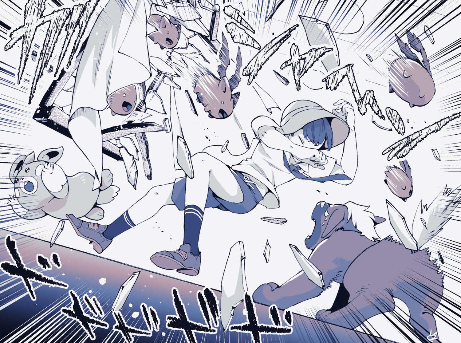1boy broken_glass broken_window closed_eyes collared_shirt curtains florian_(pokemon) full_body gen_2_pokemon glass hat hoppip ironna_r maschiff necktie nintendo pawmi pokemon pokemon_(creature) pokemon_scarlet_and_violet school_uniform shirt short_hair short_sleeves shorts socks
