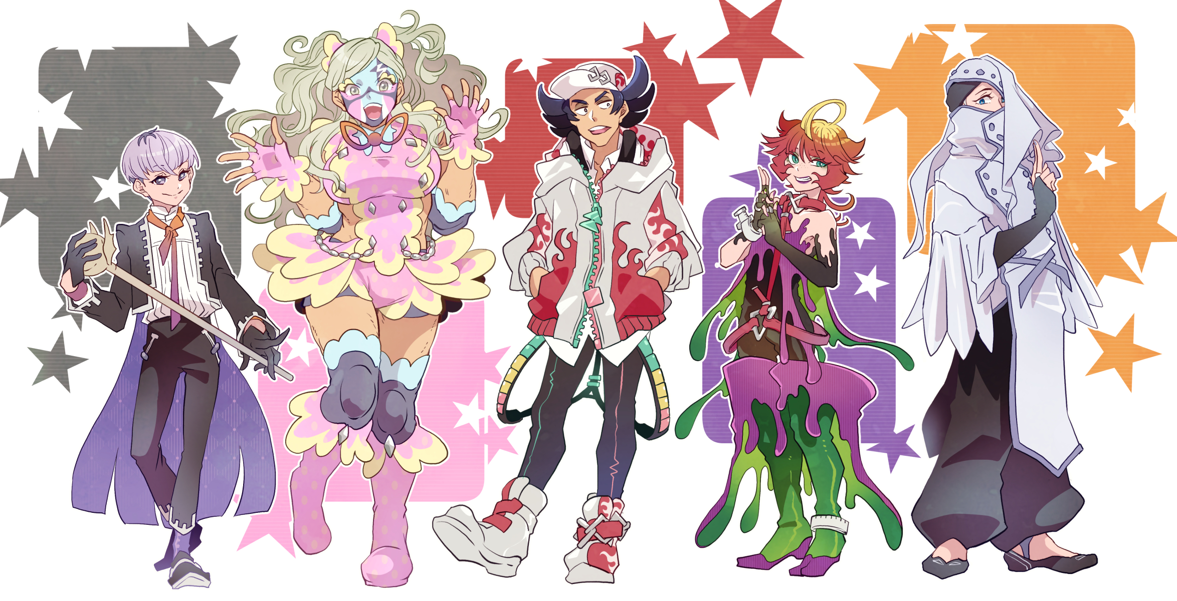 2girls 3boys ahoge atticus_(pokemon) bare_shoulders baseball_cap bike_shorts black_bodysuit black_eyes black_gloves black_hair black_jacket black_pants blonde_hair blue_eyes bodysuit boots buttons collar cosplay costume_switch eri_(pokemon) facepaint fiery_clothing fingerless_gloves freckles giacomo_(pokemon) gloves green_eyes grey_eyes grey_hair grin hands_in_pockets hat headphones headphones_around_neck highres holding holding_staff jacket kuji-in long_hair long_sleeves looking_at_viewer maruboku mela_(pokemon) multicolored_hair multiple_boys multiple_girls neck_ribbon nintendo ortega_(pokemon) pants pokemon pokemon_scarlet_and_violet purple_eyes red_hair ribbon short_hair smile staff tailcoat team_star two-tone_hair white_hair
