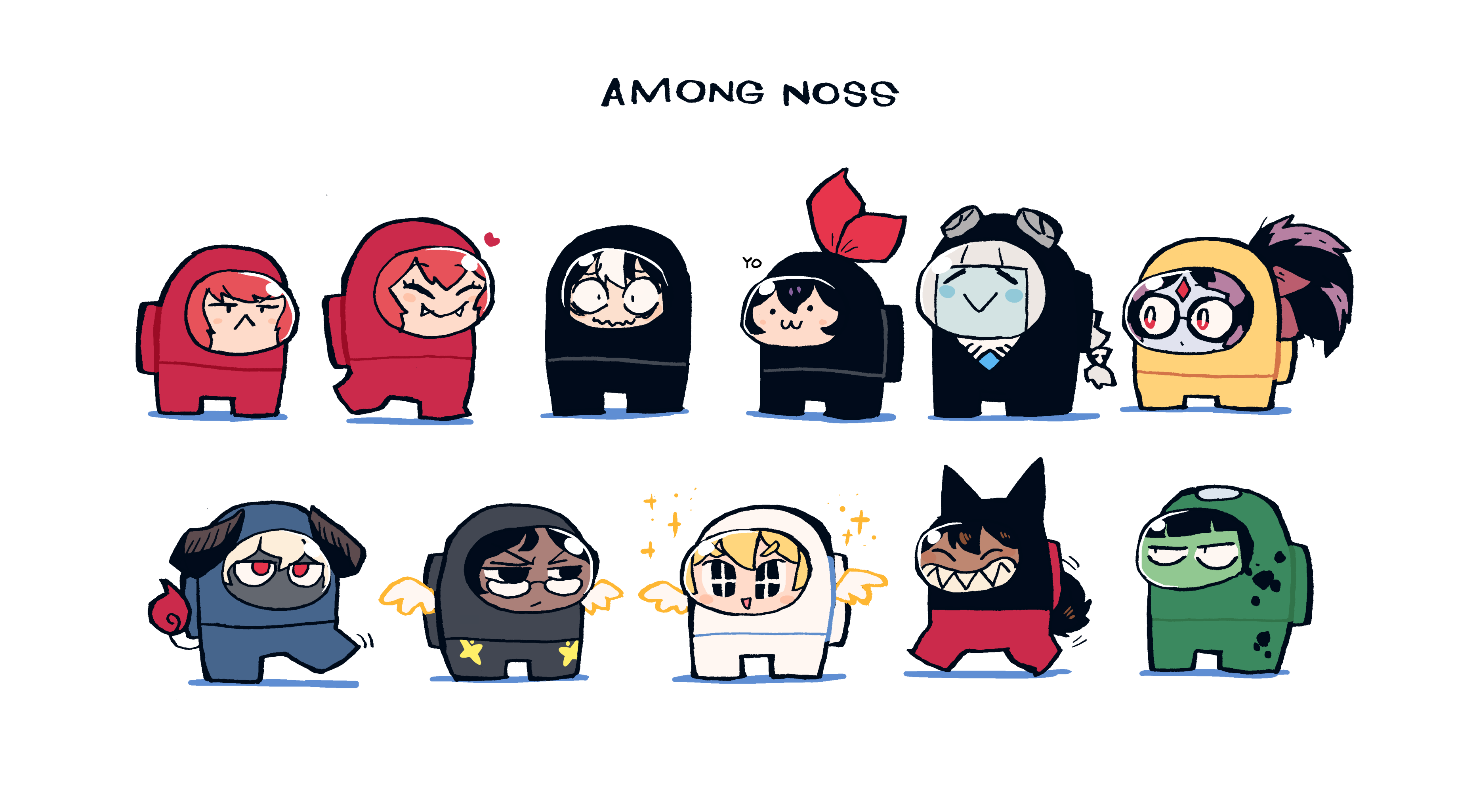 +_+ :< absurdres aldegon_(rariatto) among_us angel anya_(rariatto) black_hair blue_skin bow carla_carmilla_(rariatto) chibi closed_mouth colored_skin cosplay crewmate_(among_us) crewmate_(among_us)_(cosplay) dolk_carmilla fangs glasses grin hair_bow highres leliel_(rariatto) neneko_(rariatto) noss_(rariatto) orange_hair original ponytail rariatto_(ganguri) red_bow rudy_(rariatto) shamsiel_(rariatto) sharp_teeth simple_background smile teeth white_background zakuro_(rariatto)