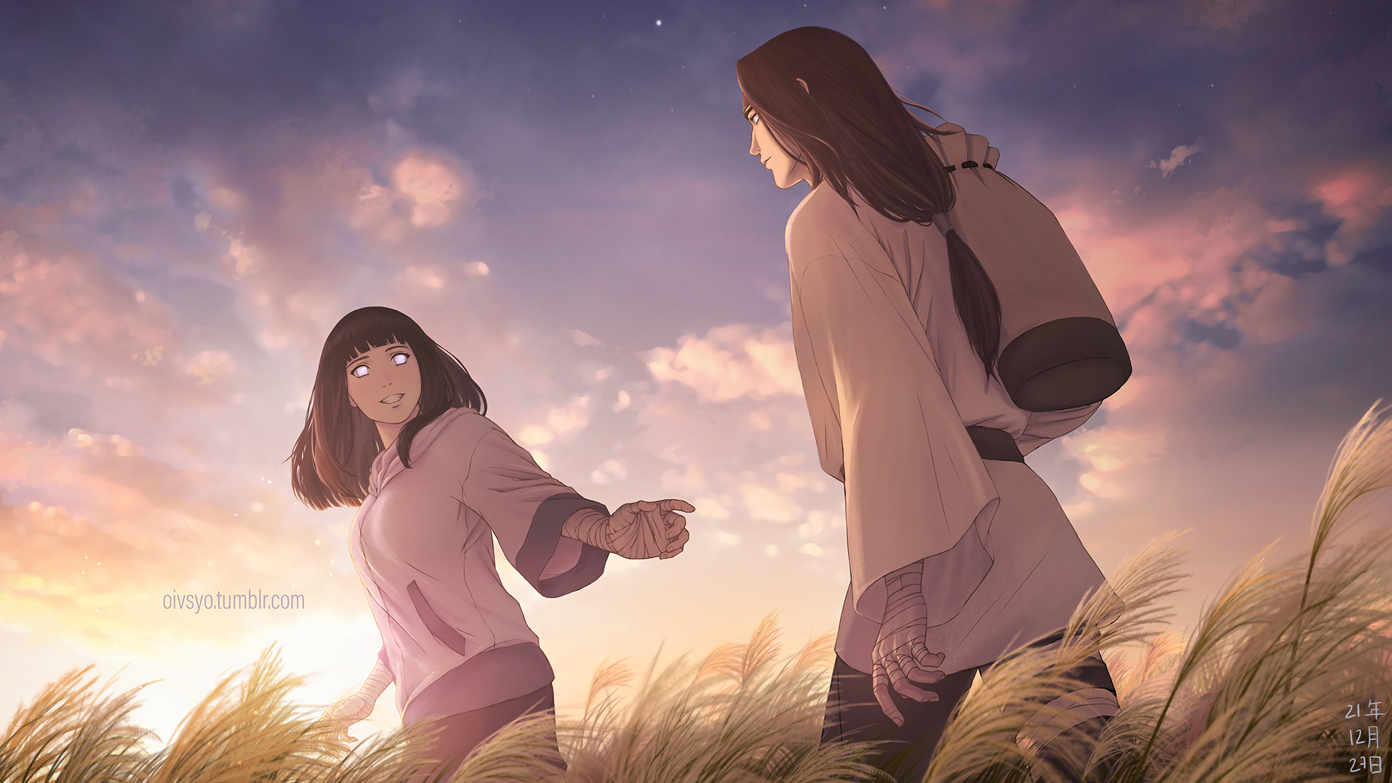 1boy 1girl bag bandaged_hand bandages black_hair byakugan cloud cloudy_sky commentary cousins english_commentary highres hyuuga_hinata hyuuga_neji long_hair long_sleeves looking_at_another low-tied_long_hair naruto_(classic) naruto_(series) oivsyo outstretched_arm shirt sky smile sunset wheat_field white_eyes white_shirt wide_sleeves