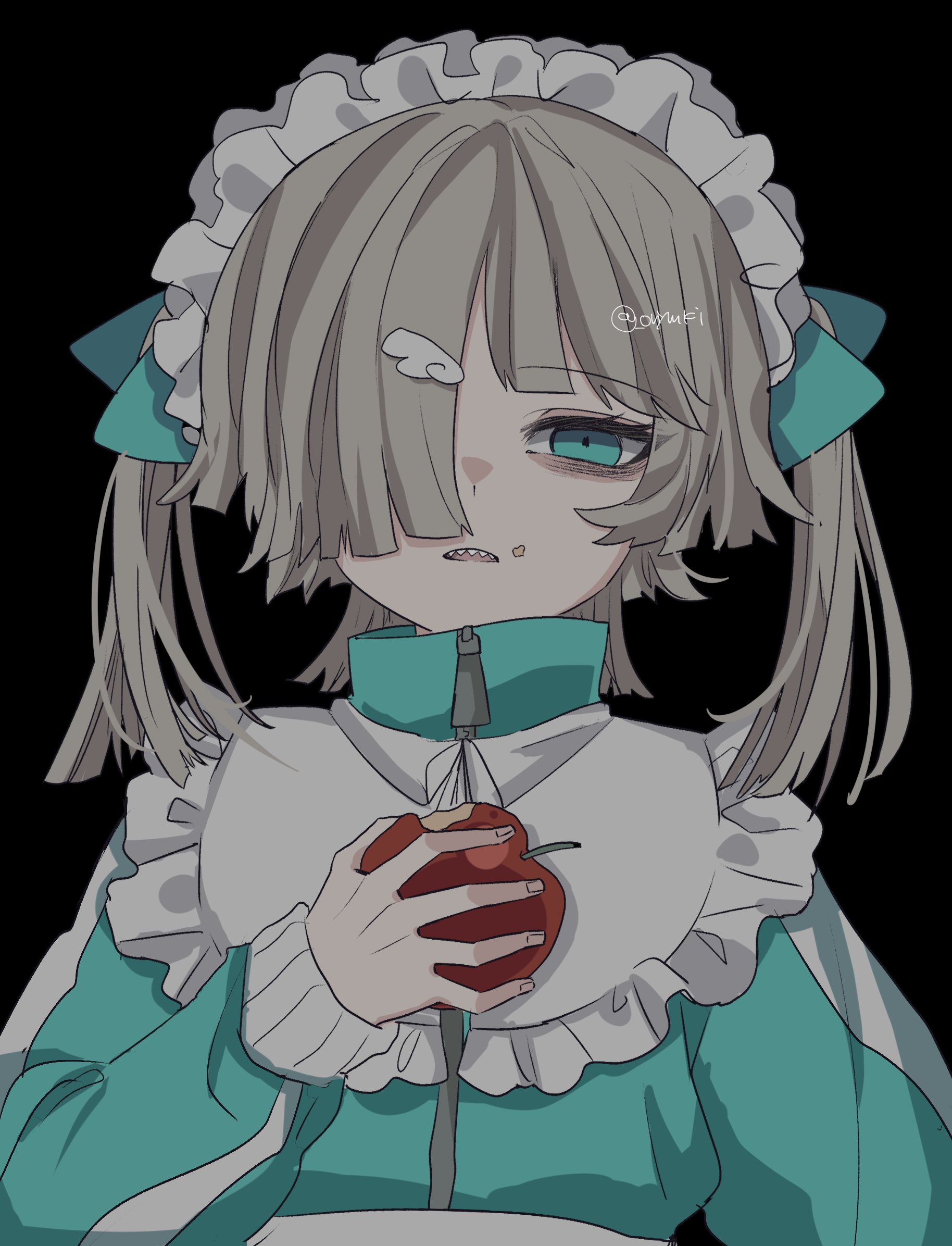 1girl apple apron bags_under_eyes bitten_apple black_background blue_bow blue_eyes blue_jacket blunt_bangs bow food food_bite food_on_face fruit hair_bow hair_ornament hair_over_one_eye half-closed_eyes hatsune_miku high_collar highres holding holding_food holding_fruit jacket jersey_maid light_brown_hair long_sleeves maid maid_apron maid_headdress medium_hair multiple_hair_bows oniyamakei sharp_teeth short_twintails simple_background solo teeth tensei_ringo_(vocaloid) track_jacket twintails twitter_username unconventional_maid upper_body vocaloid white_apron wing_hair_ornament zipper zipper_pull_tab