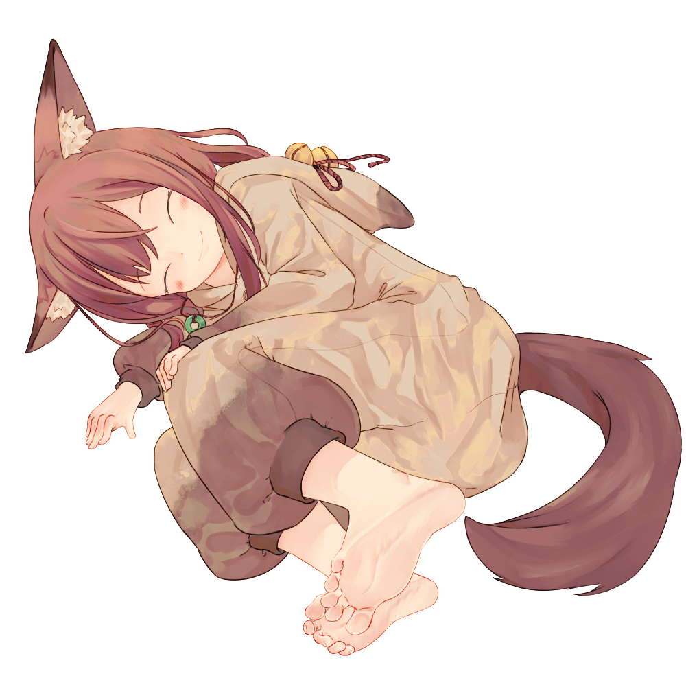 1girl ^_^ animal_ear_fluff animal_ears barefoot brown_hair chaosexceed closed_eyes closed_mouth commission feet fox_ears fox_girl full_body hood hood_down jewelry long_sleeves lying necklace on_side onesie original pixiv_commission simple_background smile soles solo spread_toes tail toe_scrunch toenails toes white_background