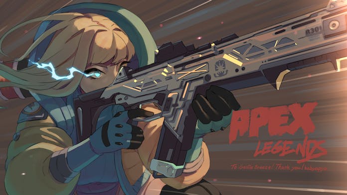 1girl alternate_hair_length alternate_hairstyle animification apex_legends assault_rifle blue_eyes blue_gloves breasts commentary commission copyright_name english_commentary eye_trail floating_hair gloves gun holding holding_gun holding_weapon hood hood_down hooded_jacket jacket kabiyapyo light_trail lightning_bolt_symbol long_hair medium_breasts mixed-language_commentary orange_jacket r-301_carbine rifle skeb_commission solo wattson_(apex_legends) weapon