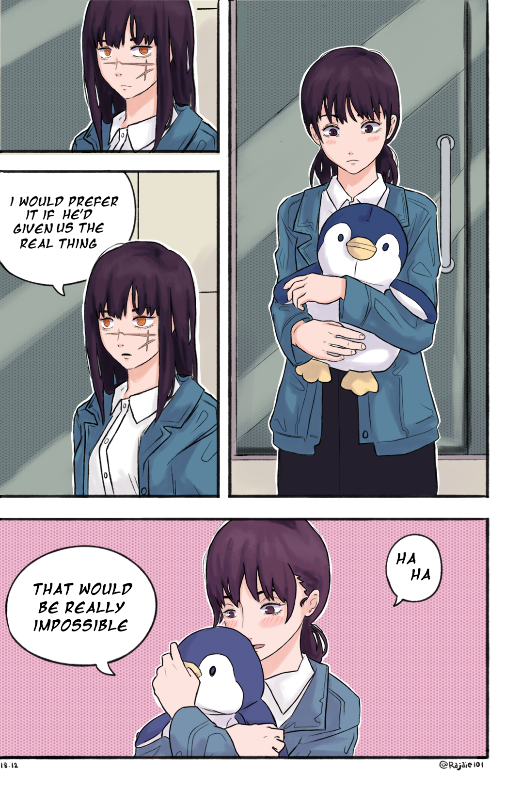 2girls black_eyes black_hair black_skirt blue_jacket blush buttons chainsaw_man collared_shirt comic commentary cross_scar dress_shirt english_commentary english_text highres holding jacket long_hair mitaka_asa multiple_girls open_clothes open_jacket rajaie101 ringed_eyes scar scar_on_face shirt skirt smile speech_bubble stuffed_animal stuffed_penguin stuffed_toy twintails twitter_username white_shirt yellow_eyes yoru_(chainsaw_man)