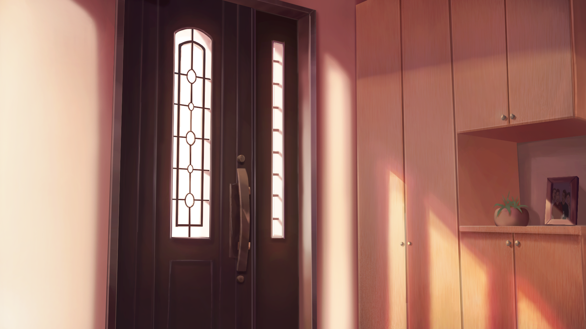 cabinet commentary_request day door entrance highres indoors kimura_(coat_corp.) manatsu_no_yo_no_inmu miura_daisenpai no_humans photo_(object) plant potted_plant scenery toono_(coat) tyb_(inmu) window yajuu_senpai