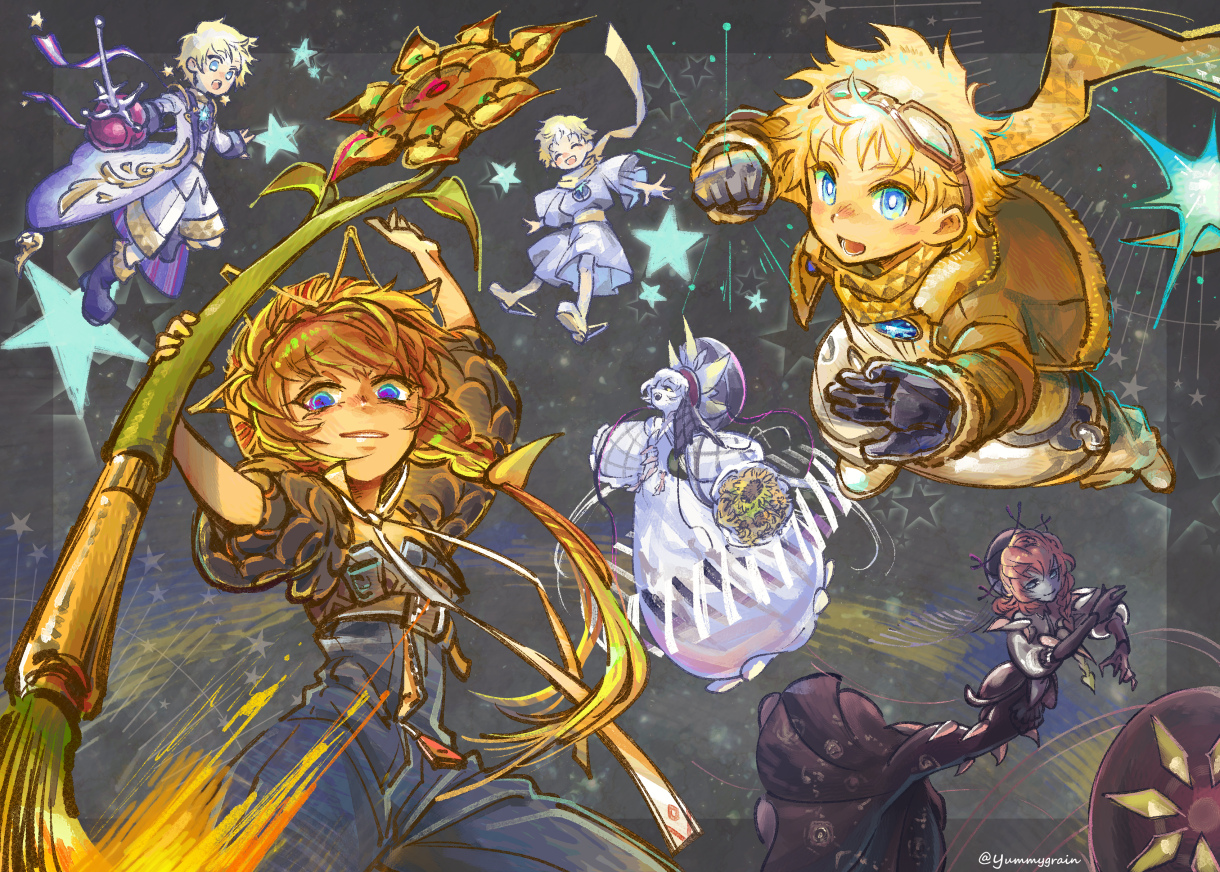 1boy 1girl blonde_hair blue_eyes blush boots braid breasts bright_pupils crown_braid fate/grand_order fate_(series) flower formal_clothes goggles goggles_on_head incoming_attack long_hair long_sleeves looking_at_viewer misuke_(gyouran) open_mouth orange_hair puffy_sleeves rose short_hair shorts side_braid small_breasts smile sunflower van_gogh_(fate) van_gogh_(first_ascension)_(fate) van_gogh_(second_ascension)_(fate) van_gogh_(third_ascension)_(fate) voyager_(fate) voyager_(second_ascension)_(fate) voyager_(third_ascension)_(fate) weapon