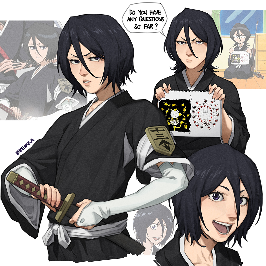 1girl artist_name black_hair black_kimono bleach blue_eyes breikka bridal_gauntlets closed_mouth commentary cropped_torso derivative_work drawing elbow_gloves english_commentary english_text fingernails gloves hair_between_eyes holding holding_notebook japanese_clothes katana kimono kuchiki_rukia lips looking_at_viewer multiple_views notebook open_mouth parted_lips pink_lips sash screenshot_redraw short_hair simple_background smile sode_no_shirayuki speech_bubble sword teeth tongue weapon white_background white_gloves