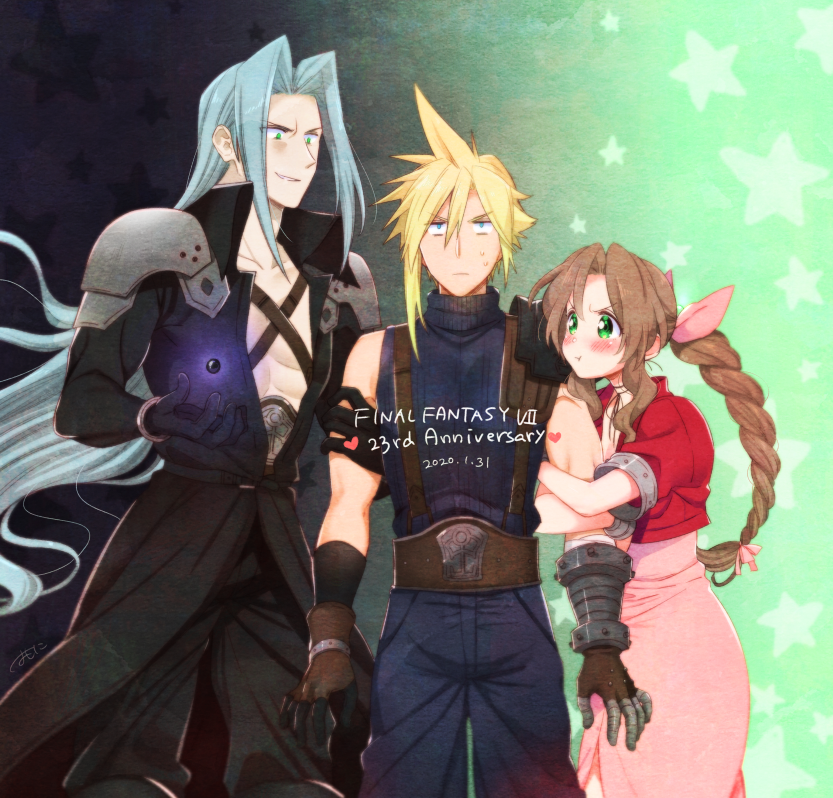 1girl 2boys aerith_gainsborough aqua_eyes arm_grab armor bad_id bad_pixiv_id bangle belt black_gloves black_jacket black_pants blonde_hair blue_pants blue_shirt blush bracelet braid braided_ponytail brown_belt brown_gloves brown_hair center_opening chest_strap choker cloud_strife cowboy_shot cropped_jacket dated dress final_fantasy final_fantasy_vii furrowed_brow gloves gradient_background green_background green_eyes grey_hair hair_between_eyes hair_ribbon jacket jewelry krudears long_bangs long_dress long_hair long_jacket long_sleeves materia multiple_boys pants parted_bangs pink_dress pink_ribbon pout puffy_short_sleeves puffy_sleeves red_jacket ribbon ribbon_choker sephiroth shirt short_hair short_sleeves shoulder_armor sidelocks single_bare_shoulder sleeveless sleeveless_turtleneck spiked_hair square_enix star_(symbol) suspenders sweatdrop turtleneck v-shaped_eyebrows wavy_hair