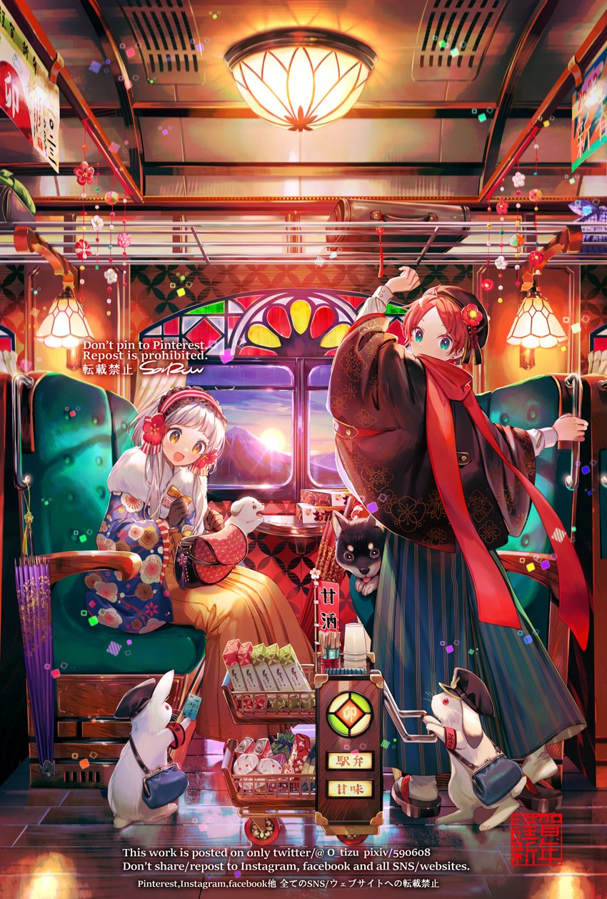 2girls coat dog green_eyes hat highres multiple_girls naru_(andante) original rabbit sitting standing suitcase train white_hair window