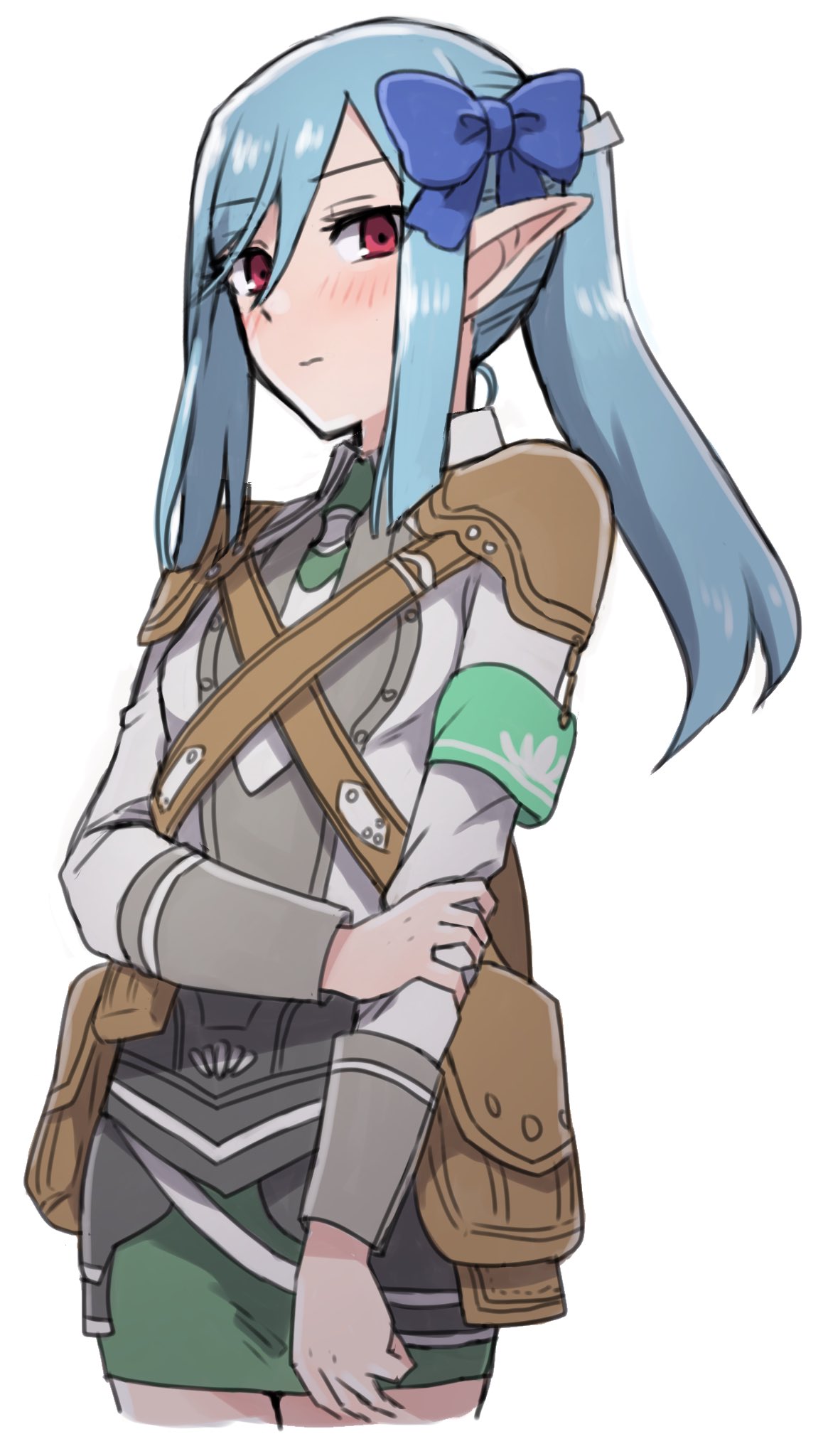 1girl apo_518 aqua_armband armband blue_bow blue_hair blush bow breasts closed_mouth commentary_request cowboy_shot eyes_visible_through_hair green_armband green_skirt hair_between_eyes hair_bow hand_on_own_arm highres legs_together light_blue_hair long_hair long_sleeves miniskirt pointy_ears ponytail pouch red_eyes rune_factory rune_factory_5 scarlett_(rune_factory) shirt shoulder_pads simple_background skirt small_breasts solo swept_bangs white_background white_shirt