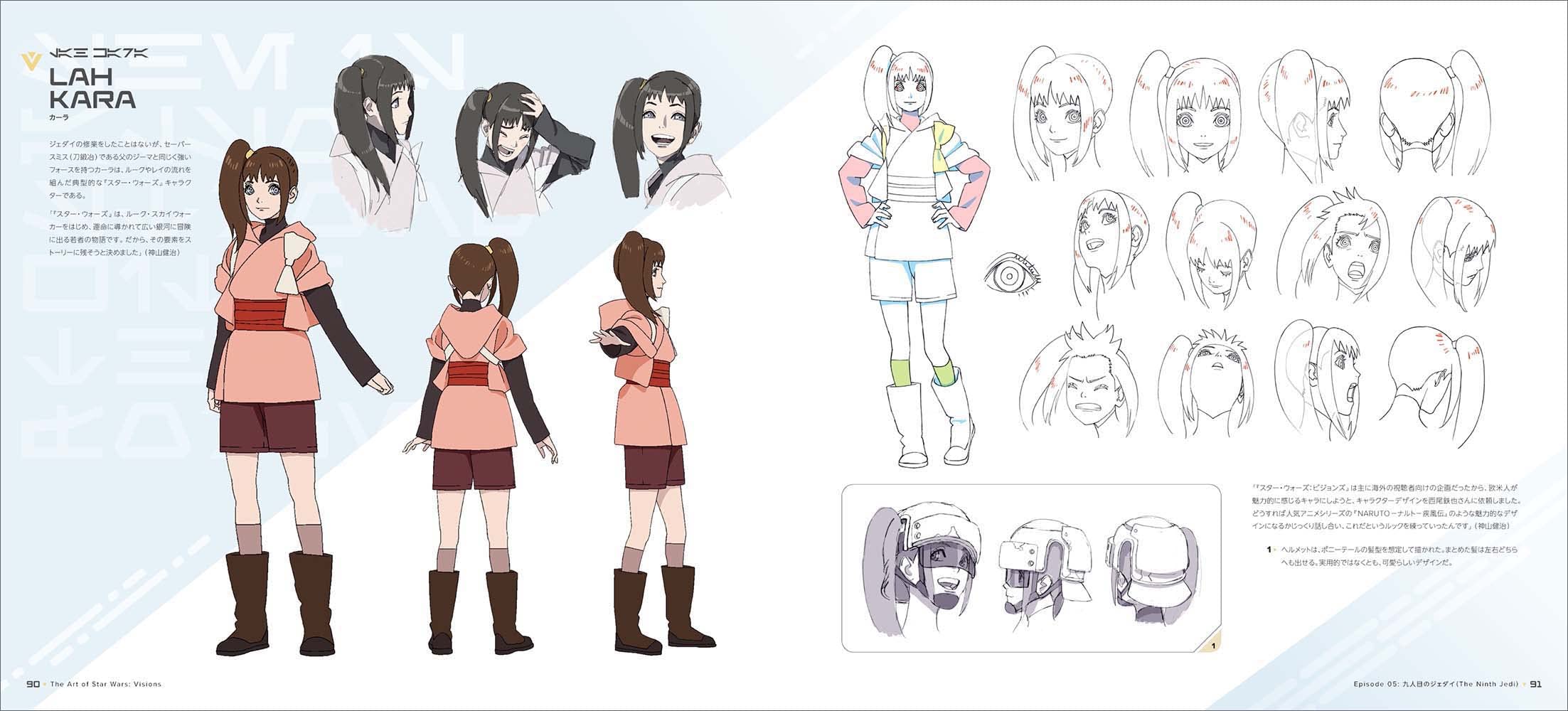 1girl brown_hair brown_socks reference_sheet colorized concept_art multiple_expressions helmet highres japanese_text kara_(star_wars) monochrome official_art open_mouth ponytail production_i.g production_ig promotional_art short_hair short_pants shorts sidelocks sideways sideways_glance sideways_mouth sketch socks star_wars star_wars:_visions tongue