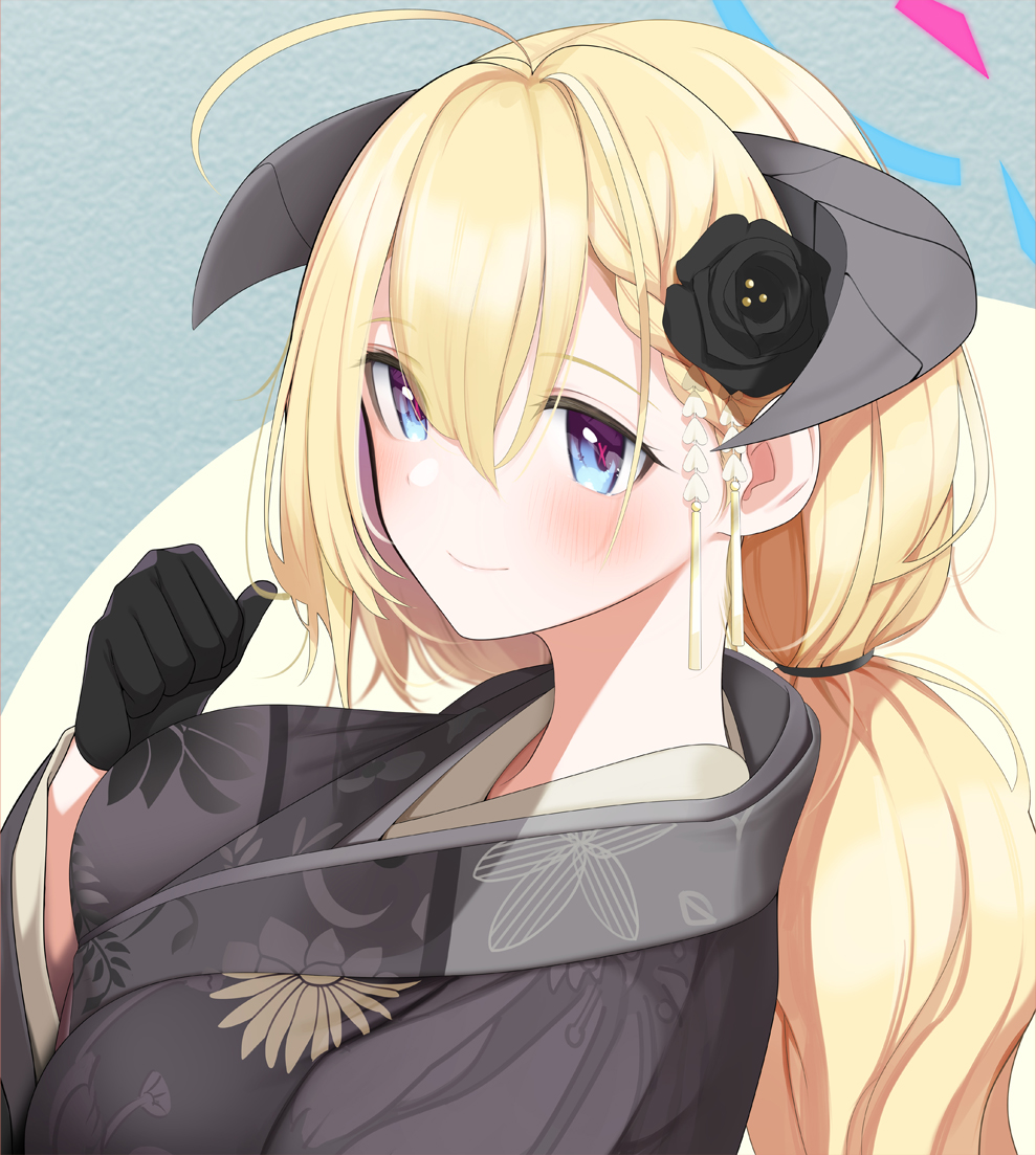 1girl akari_(blue_archive) black_gloves blonde_hair blue_archive blue_eyes fed_(giba) gloves halo horns japanese_clothes official_alternate_costume ponytail solo upper_body