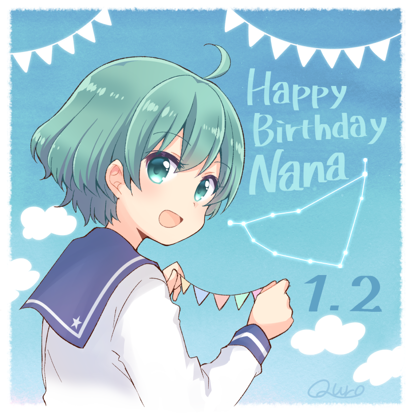 1girl :d ahoge blue_sailor_collar capricorn_(constellation) constellation constellation_print green_eyes green_hair hair_between_eyes hair_ornament happy_birthday koisuru_asteroid looking_at_viewer nanami_yuu open_mouth quro_(black_river) sailor_collar school_uniform serafuku shirt short_hair skirt sky smile solo upper_body white_shirt
