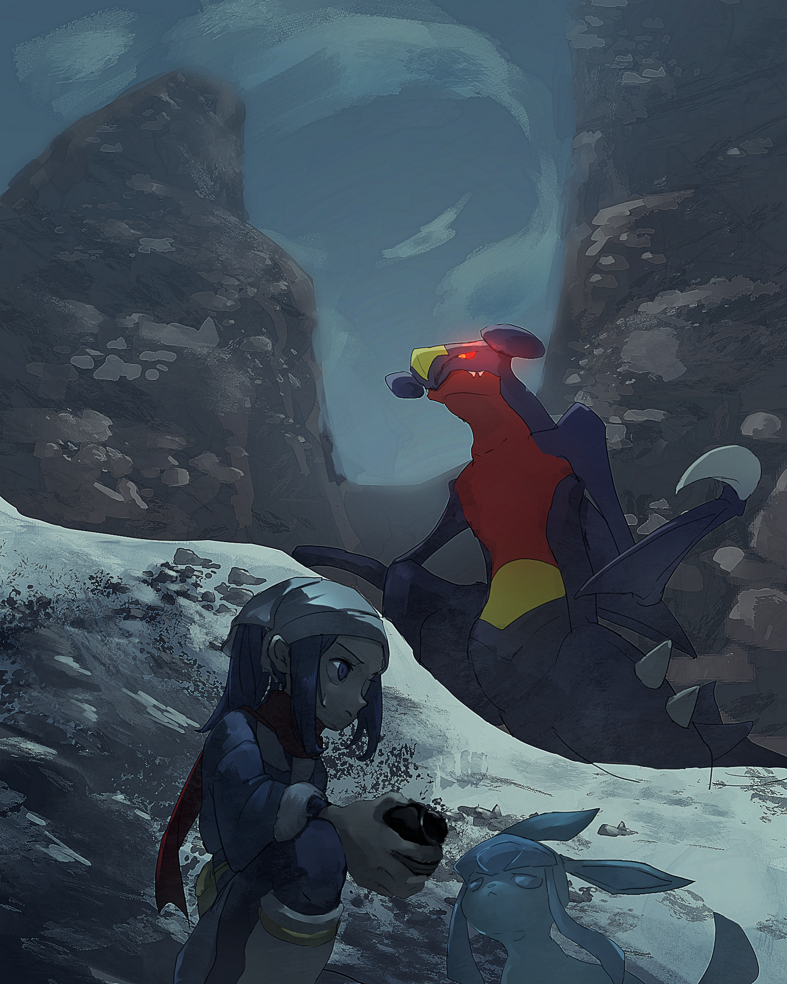 1girl akari_(pokemon) alpha_pokemon black_hair closed_mouth commentary_request fangs fangs_out garchomp gen_4_pokemon glaceon glowing glowing_eyes headscarf highres hisuian_heavy_ball holding holding_poke_ball jacket long_hair mazel nintendo on_one_knee outdoors pants poke_ball pokemon pokemon_(creature) pokemon_legends:_arceus ponytail rock sidelocks snow white_headscarf