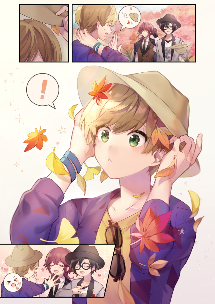 ! 1623 3boys black_hair blonde_hair blush closed_eyes dankira!!! glasses green_eyes hat leaf long_sleeves maple_leaf miki_nozomu mole mole_under_eye multicolored_hair multiple_boys red_hair short_hair sun_hat tsubaki_seito white_background yagami_soma