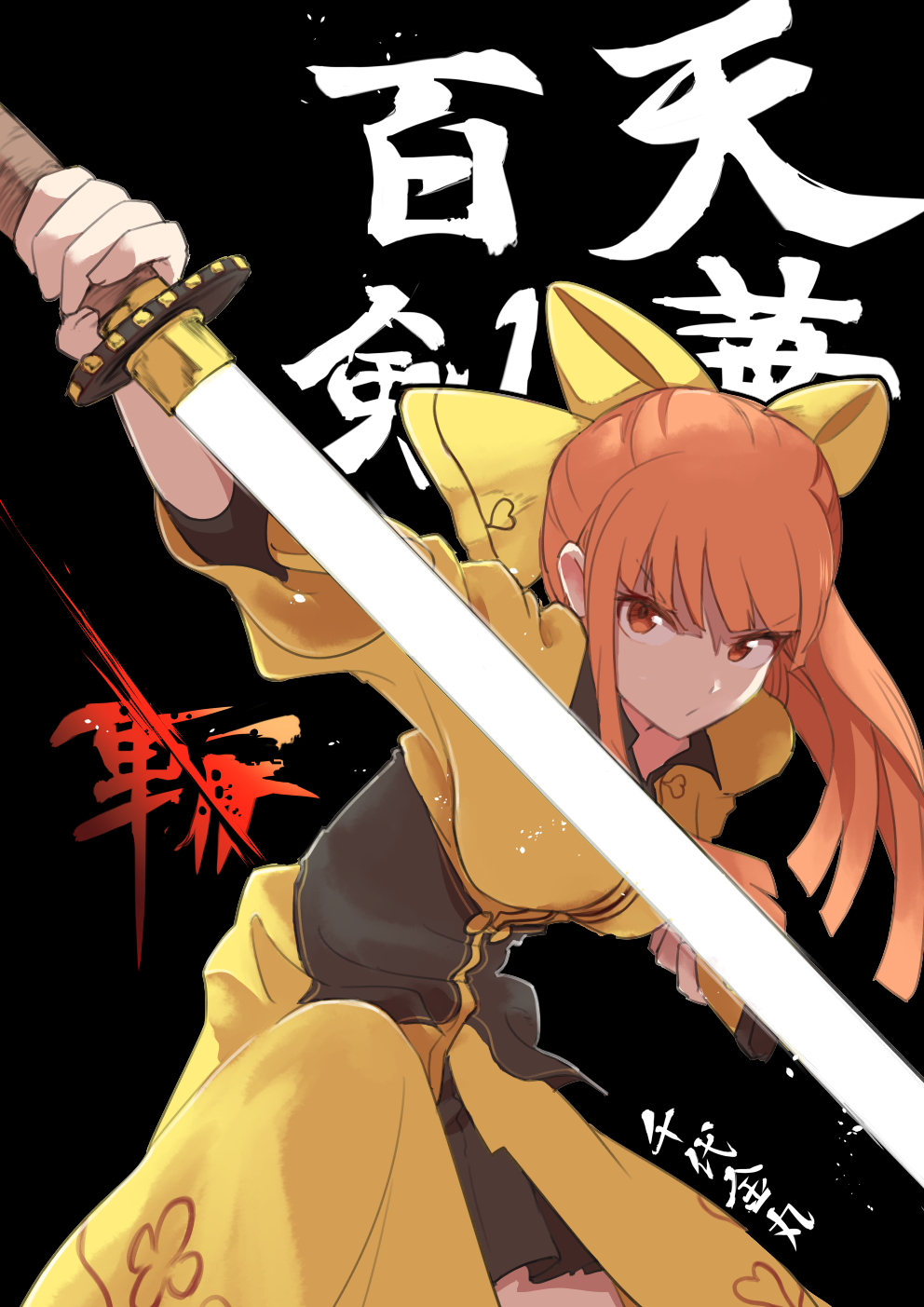 1girl black_background highres japanese_clothes katana orange_eyes orange_hair ribbon sword tenka_hyakken tominofujin weapon yellow_ribbon