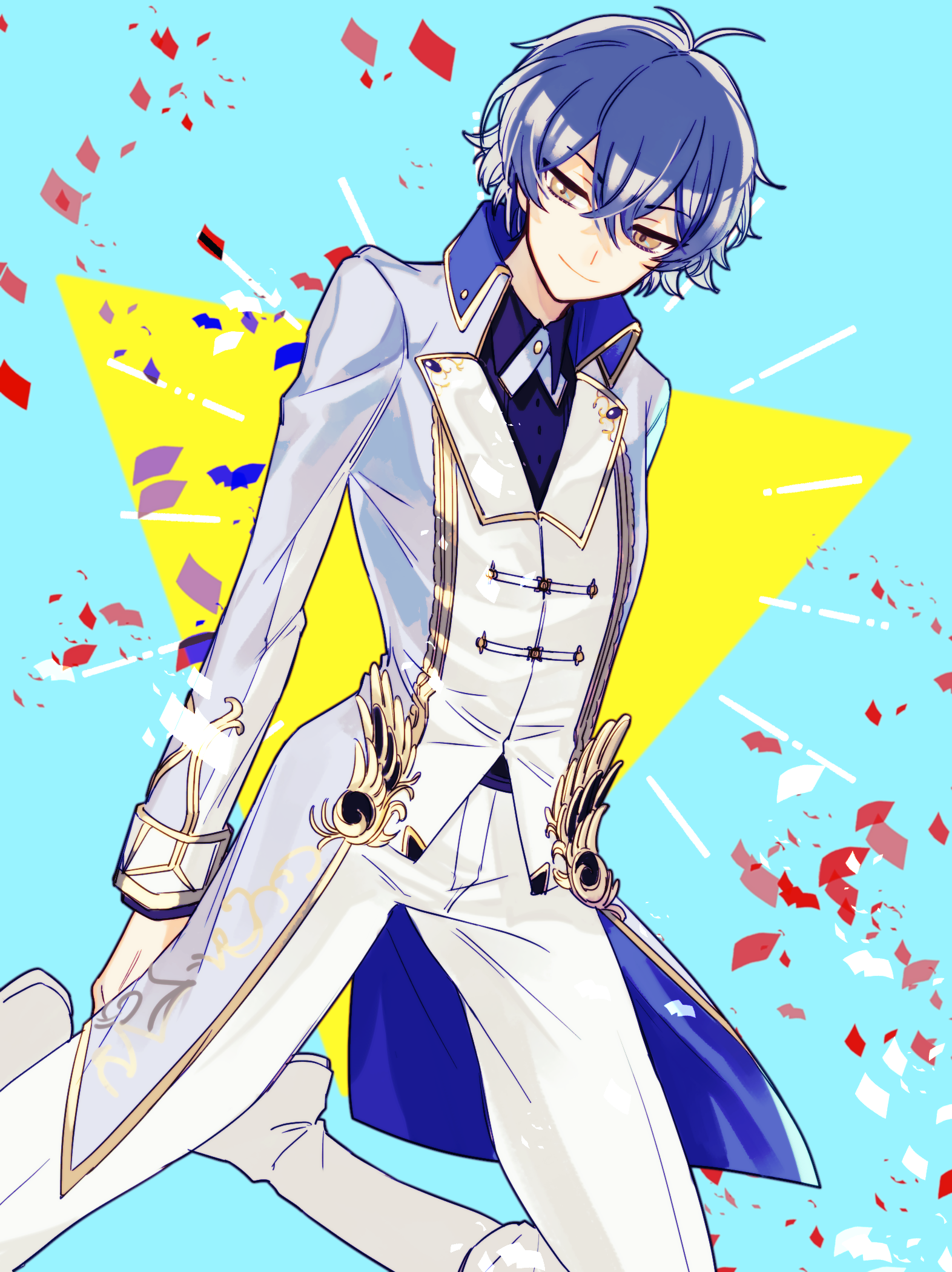 1boy blue_background blue_hair closed_mouth dankira!!! formal_clothes geta_(epicure_no12) highres kagemiya_kei looking_at_viewer male_focus multicolored_background red_background short_hair smile solo suit triangle white_background yellow_background yellow_eyes
