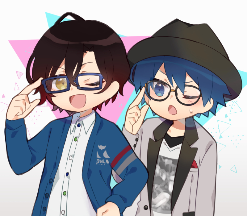 1623 2boys blue_eyes blue_hair blush brown_hair chibi dankira!!! fedora glasses hat looking_at_viewer multicolored_hair multiple_boys one_eye_closed open_mouth red_hair short_hair sweatdrop yagami_soma yano_reiji yellow_eyes