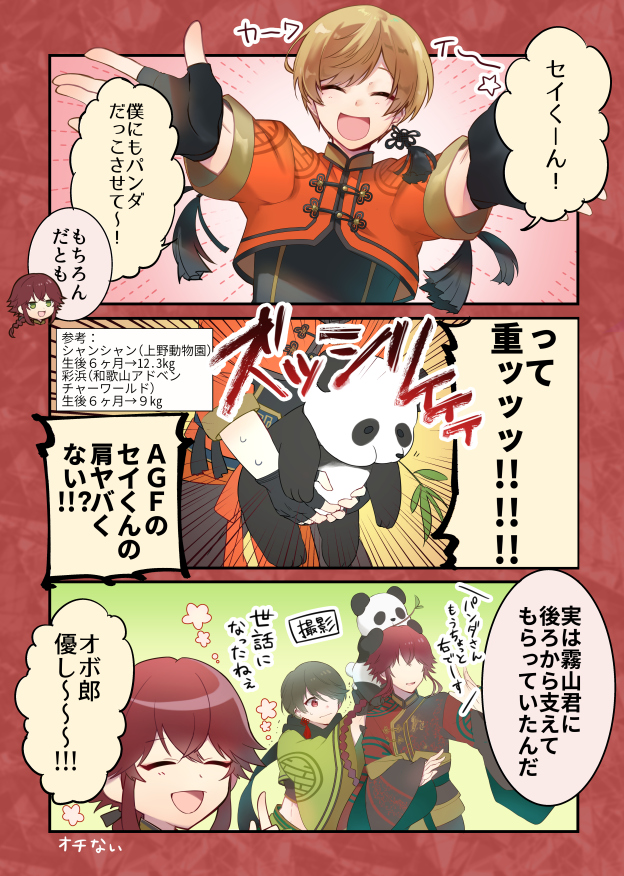 1623 3boys blonde_hair blush brown_hair chinese_clothes closed_eyes comic dankira!!! green_eyes hair_over_one_eye kiriyama_oboro long_braid long_hair male_focus miki_nozomu multiple_boys open_mouth panda red_eyes red_hair short_hair smile stuffed_animal stuffed_panda stuffed_toy translation_request tsubaki_seito
