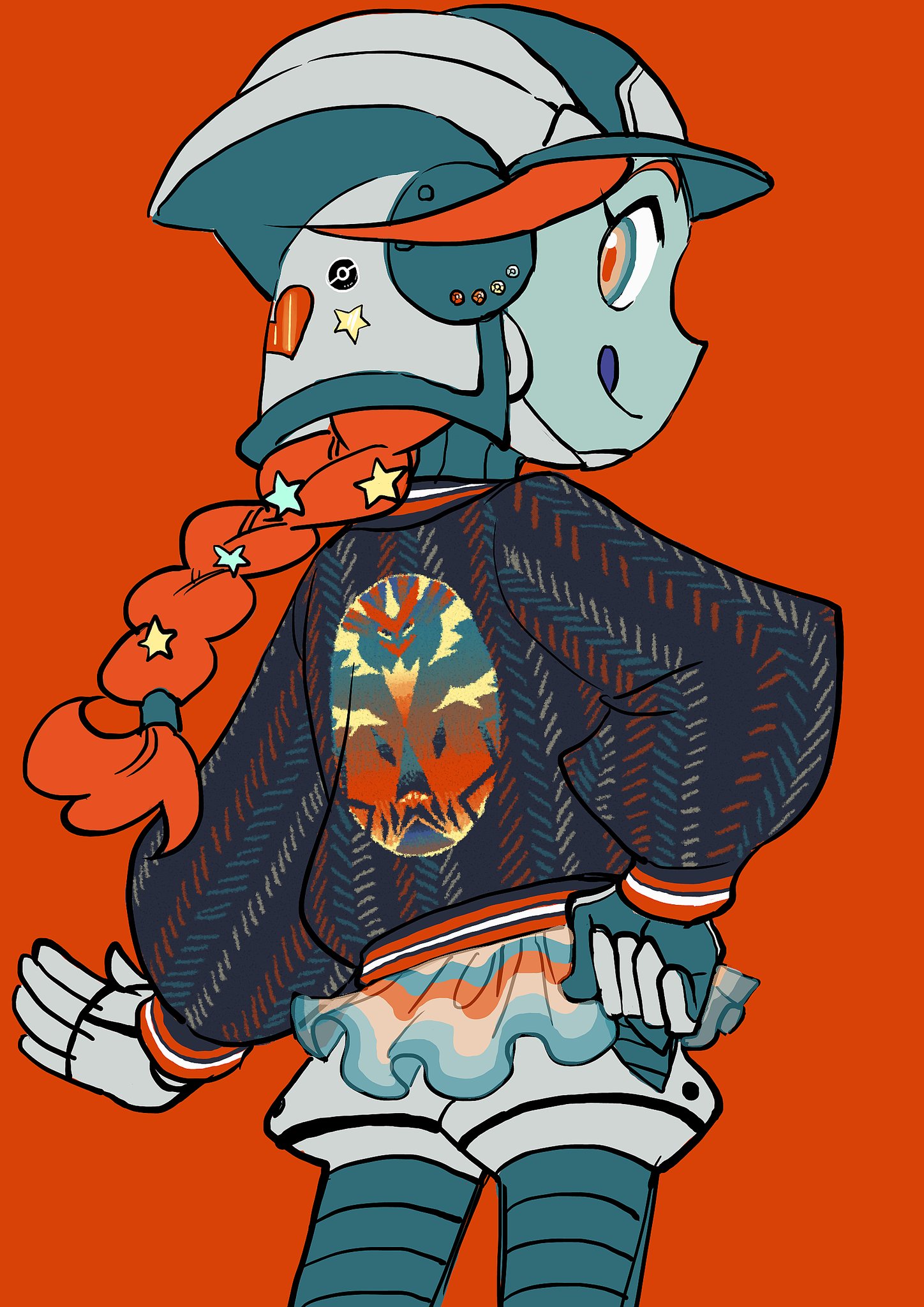 1girl :q alternate_costume braid braided_ponytail character_print closed_mouth colored_skin commentary cowboy_shot elizabeth_(tomas21) from_behind gen_7_pokemon gloves green_skin hair_ornament hand_on_own_hip helmet highres jacket legendary_pokemon long_hair long_sleeves looking_at_viewer looking_back necrozma necrozma_(ultra) nintendo orange_background orange_hair pokemon pokemon_usum print_jacket red_pupils simple_background smile solo star_(symbol) star_hair_ornament swept_bangs tongue tongue_out zossie_(pokemon)
