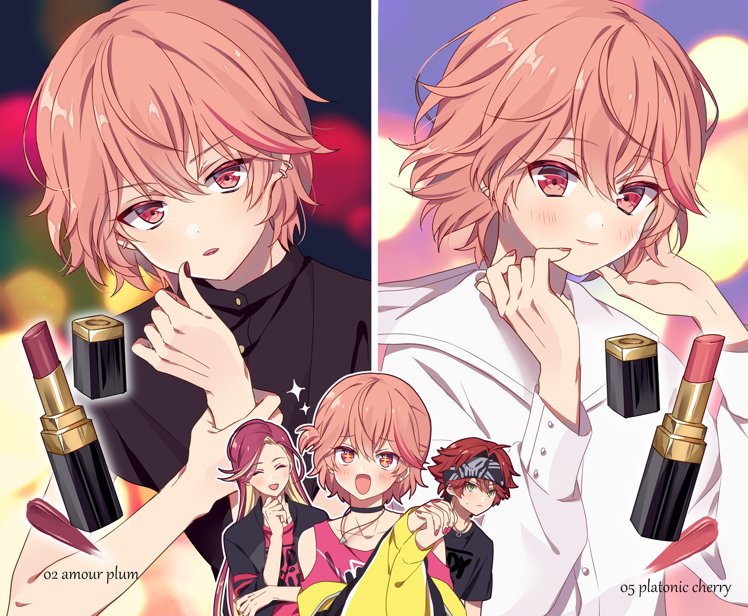 1other 2boys androgynous blonde_hair blush dankira!!! highres hinata_mahiru kurenai_ageha lipstick long_hair looking_at_viewer makeup multicolored_hair multiple_boys nail_polish pink_eyes pink_hair red_hair riku_(melty_drop) short_hair trap tsubaki_kento