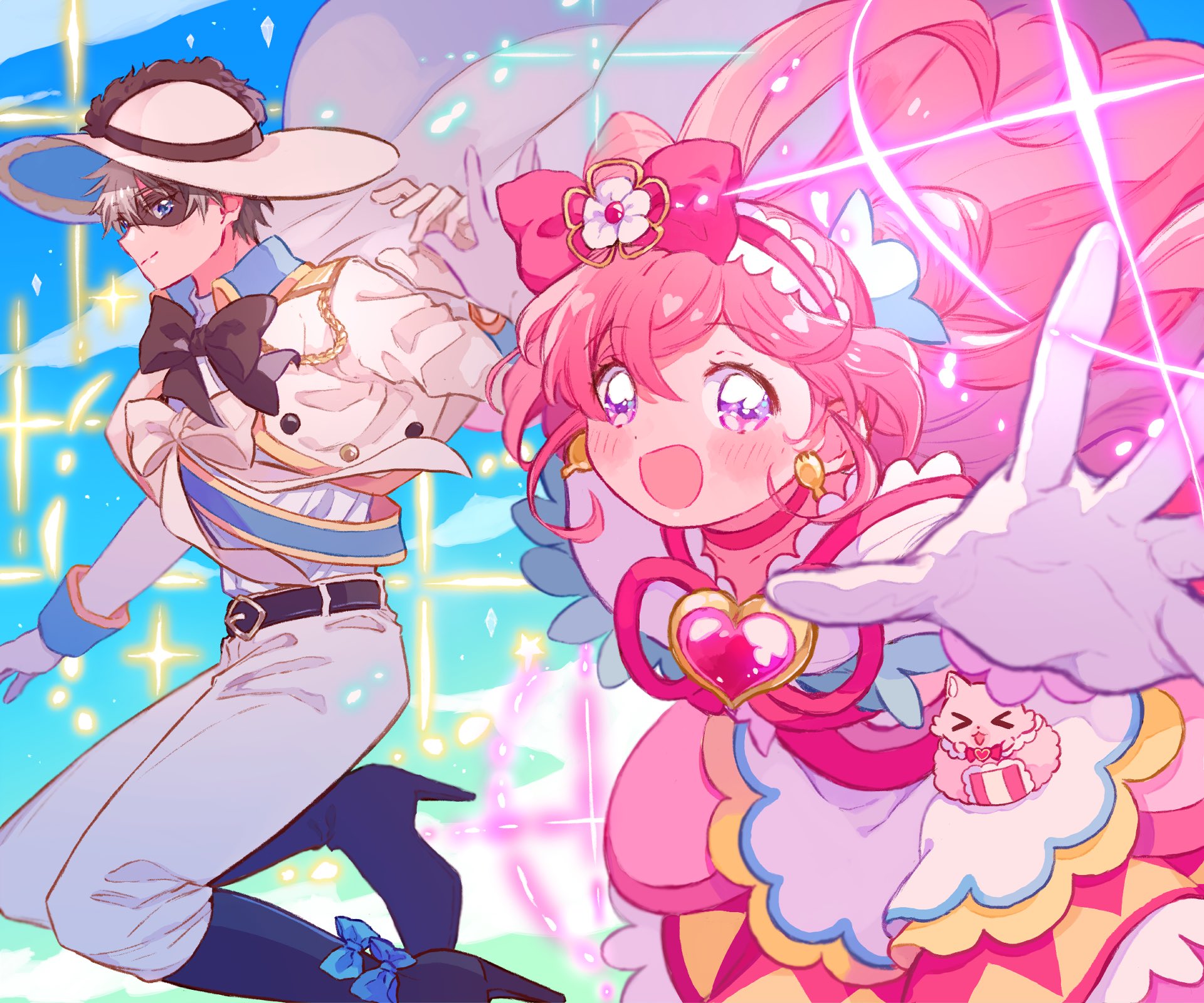 1boy 1girl apron belt black_bow black_footwear black_pepper_(precure) blue_eyes boots bow brooch cape choker commentary_request cone_hair_bun cure_precious delicious_party_precure domino_mask earrings eye_mask footwear_bow gloves grey_hair hair_bun hat_feather heart heart_brooch highres jewelry kiocotton kome-kome long_hair magical_girl mask nagomi_yui pink_choker pink_hair precure purple_eyes shinada_takumi two_side_up very_long_hair white_bow white_cape white_gloves white_headwear
