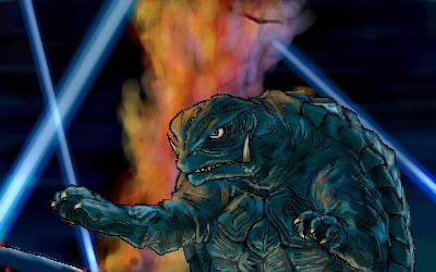 asai_takuma baseball_stadium daiei_film dome explosion fire flying fukuoka_paypay_dome gamera gamera:_guardian_of_the_universe gamera_(series) green_eyes gyaos kaiju lowres monster night no_humans real_world_location sea_monster searchlight spotlight stadium turtle tusks wings