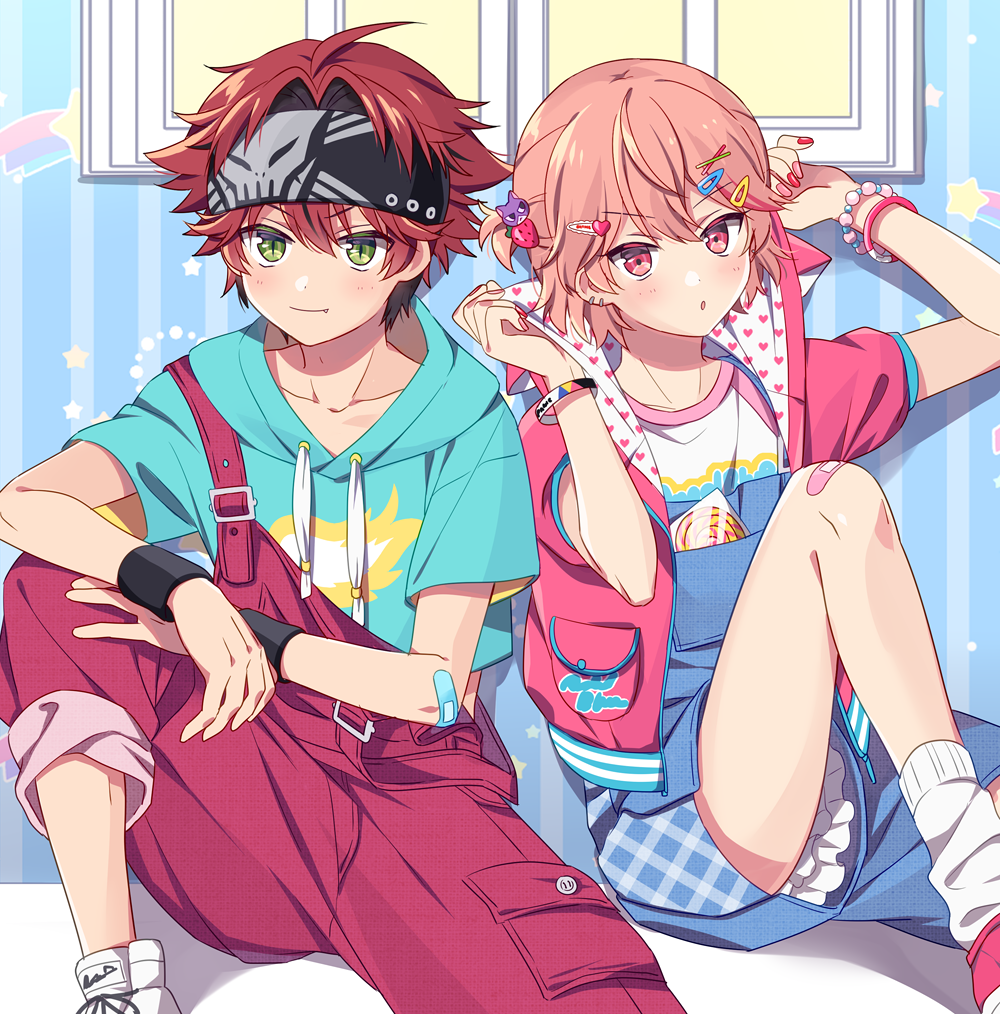 2boys :o blue_background dankira!!! fang green_eyes hinata_mahiru jojifuku looking_at_viewer multiple_boys nail_polish open_mouth overalls pink_eyes pink_hair pink_nails red_hair red_nails riku_(melty_drop) short_hair shorts suspenders trap tsubaki_kento