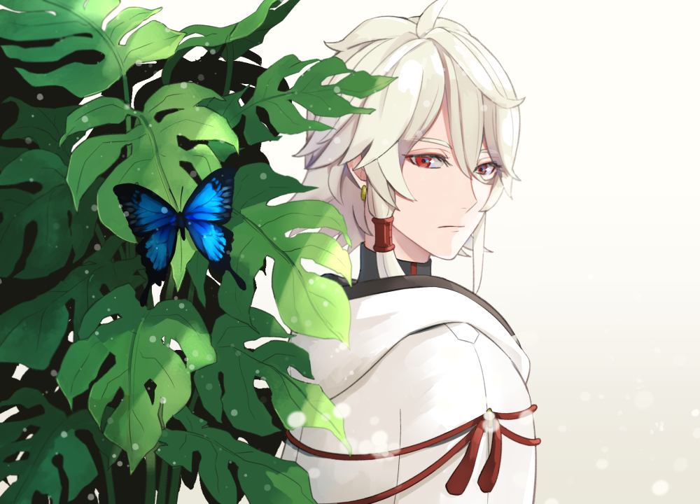 1other appleurchin blue_butterfly bug butterfly earrings hair_tubes hood hood_down insect jewelry looking_at_viewer plant red_eyes seikaisuru_kado solo upper_body white_hair yaha-kui_zashunina
