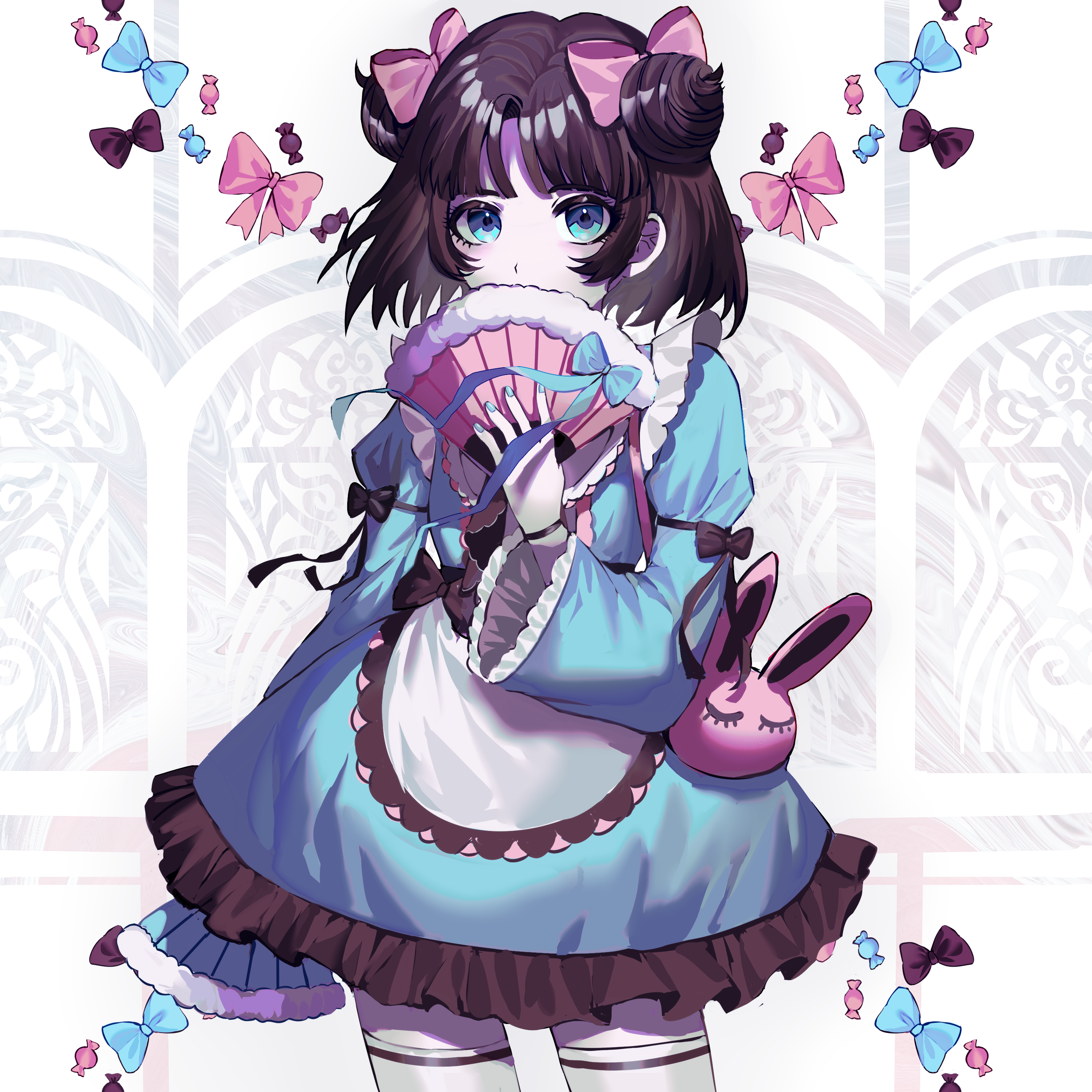 1girl absurdres animal_bag apron bag blue_eyes bow bracelet brown_hair candy comiclove1314 covering_own_mouth double_bun dress folding_fan frilled_dress frills hair_bow hair_bun hand_fan highres holding holding_fan jewelry juliet_sleeves kayura_toshiko long_sleeves looking_at_viewer nail_polish parted_bangs project:_eden's_garden puffy_sleeves rabbit_bag ribbon short_hair shoulder_bag solo thighhighs two_side_up waist_apron wrapped_candy