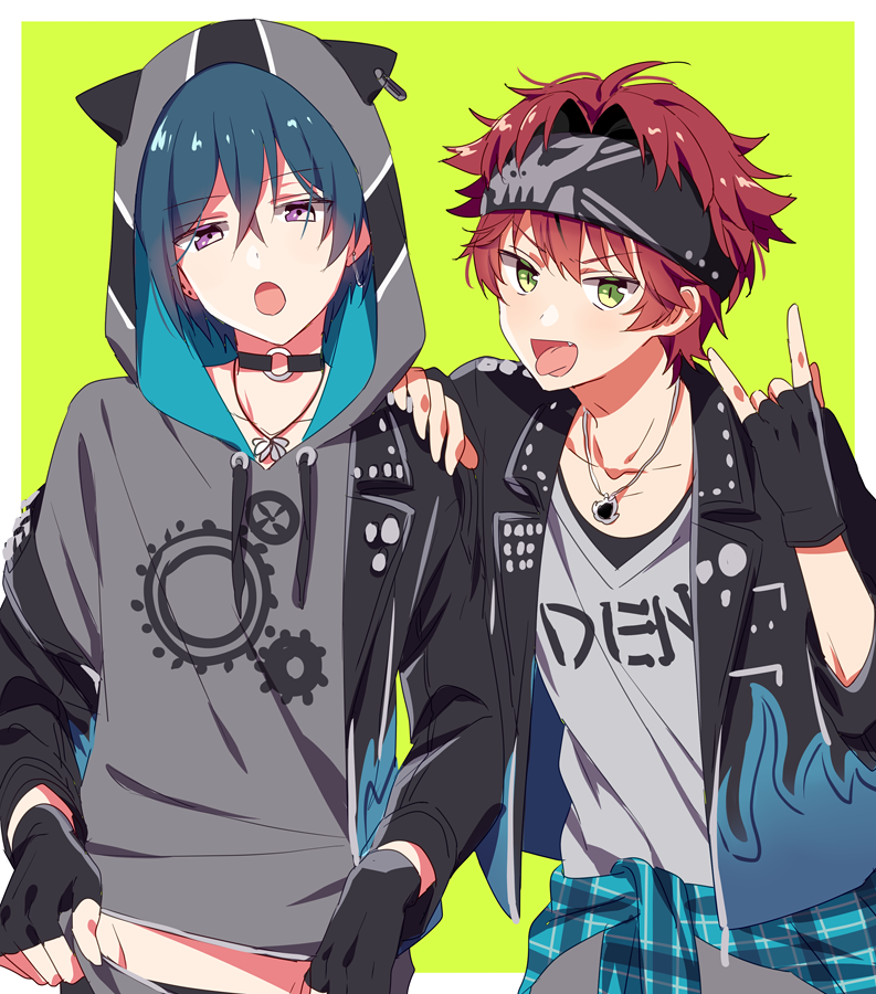 2boys animal_ears atago_rentaro blue_hair border choker dankira!!! fake_animal_ears fingerless_gloves gloves green_eyes hood hood_up looking_at_viewer male_focus multiple_boys open_mouth purple_eyes red_hair riku_(melty_drop) short_hair tsubaki_kento white_border yellow_background