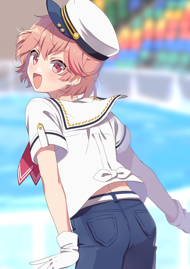 1boy blue_sailor_collar blue_shorts blush dankira!!! gloves hat hinata_mahiru looking_at_viewer male_focus open_mouth pink_eyes pink_hair riku_(melty_drop) sailor_collar sailor_hat shirt short_hair shorts solo trap white_gloves white_shirt