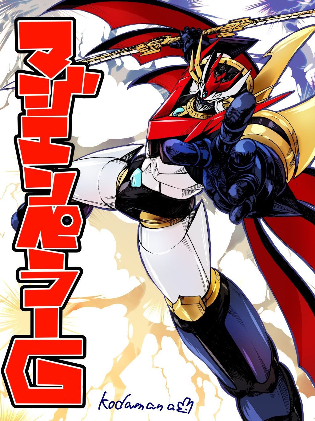 artist_name character_name double_blade explosion highres holding holding_sword holding_weapon looking_at_viewer mazin_emperor_g mazinger_(series) mecha no_humans open_hand robot science_fiction solo super_robot sword weapon yellow_eyes yuzupapa
