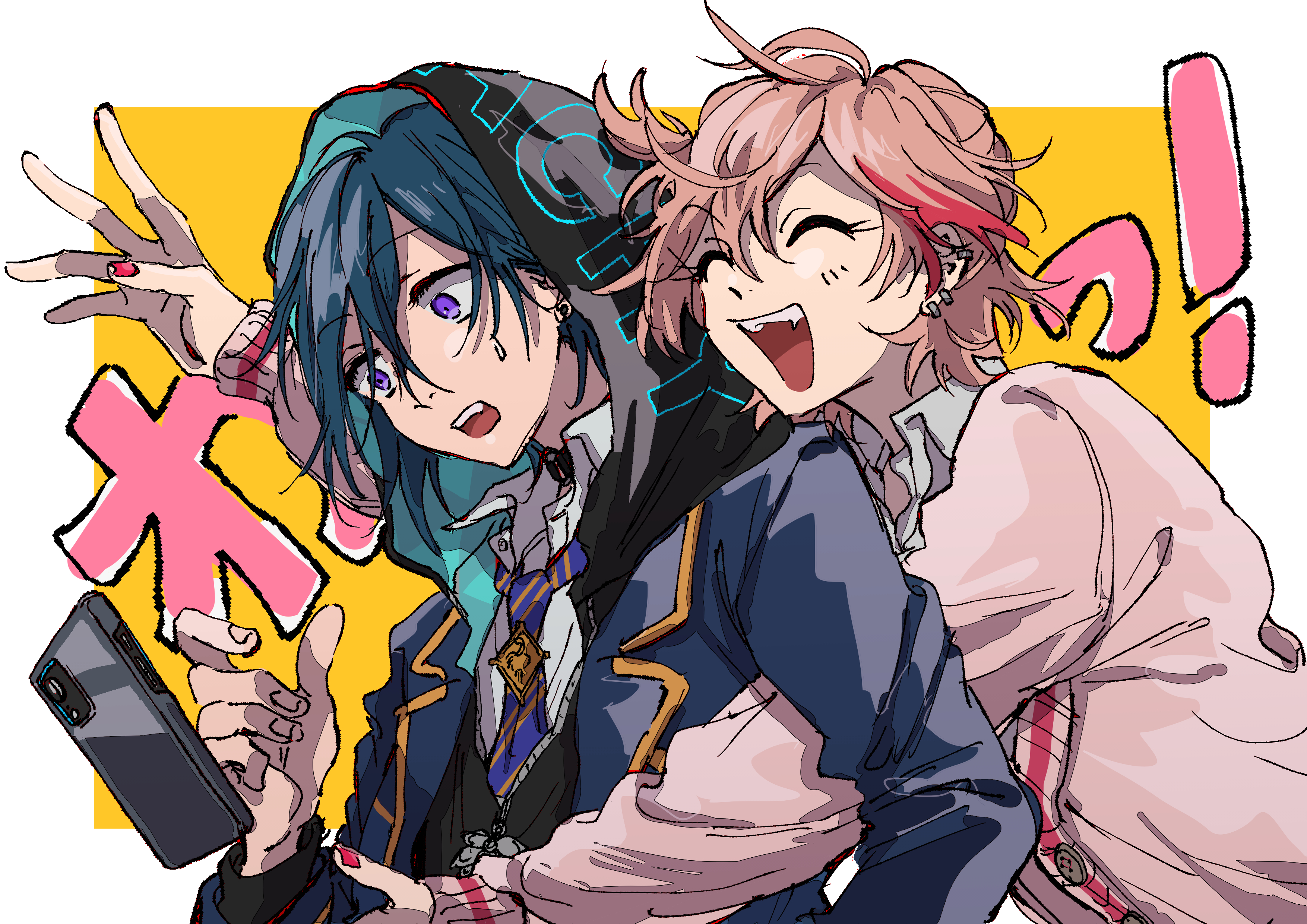 2boys absurdres atago_rentaro blue_hair blush closed_eyes dankira!!! glomp highres hinata_mahiru hug hug_from_behind ikashim_(scp_ika) long_sleeves multicolored_background multiple_boys open_mouth pink_hair purple_eyes smile surprised trap white_background yaoi yellow_background