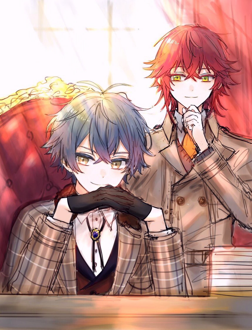 2boys blue_hair brown_eyes closed_mouth curtains dankira!!! gloves green_eyes head_rest kagemiya_kei long_sleeves male_focus multiple_boys red_hair short_hair sitting smile tsubaki_seito window yukinotihare
