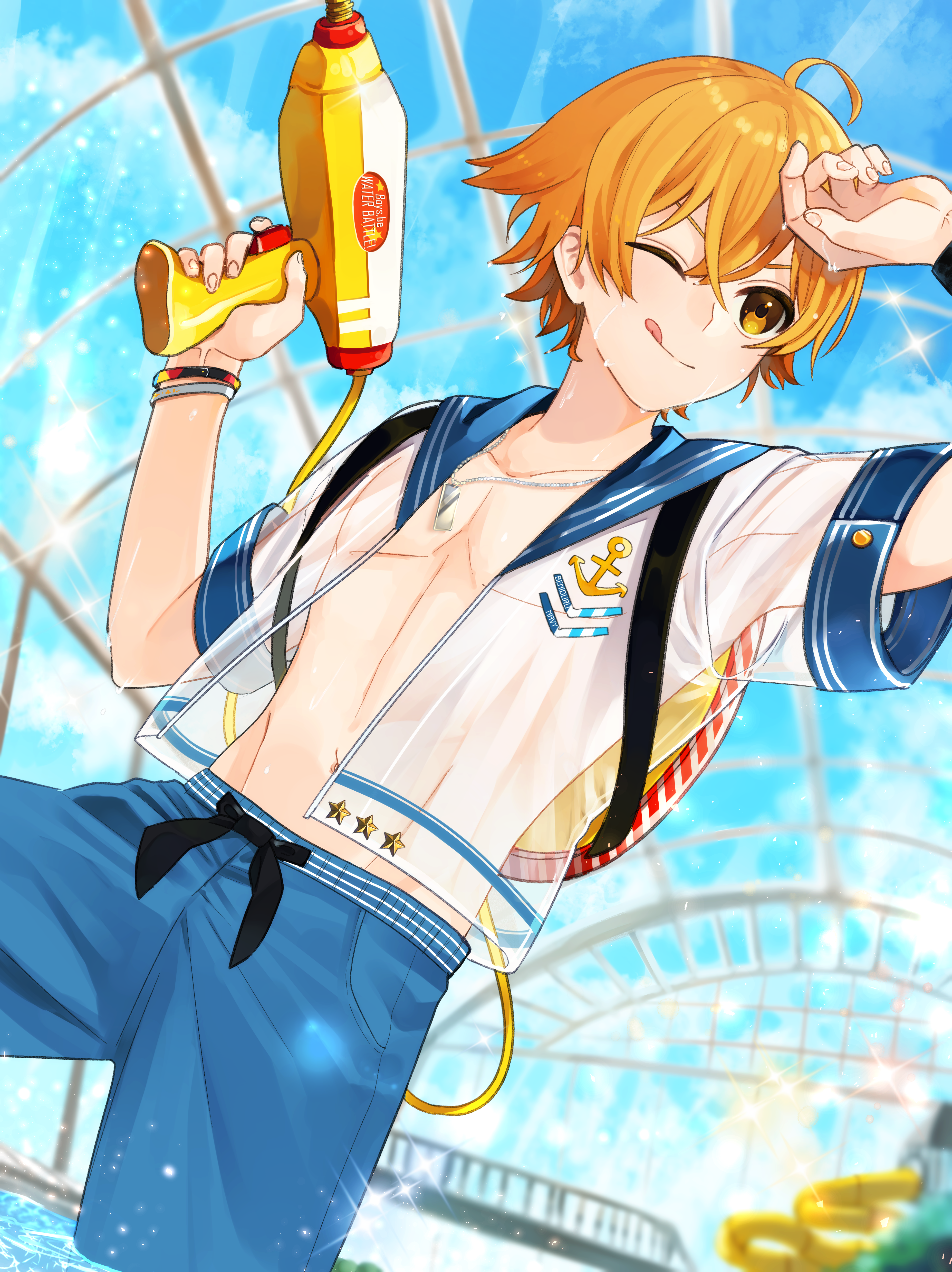 1boy absurdres ahoge asahi_sora asuma_(hanezu) blonde_hair blue_sailor_collar dankira!!! highres holding holding_water_gun male_focus one_eye_closed sailor_collar see-through_clothes see-through_shirt short_hair solo tongue tongue_out water_gun yellow_eyes