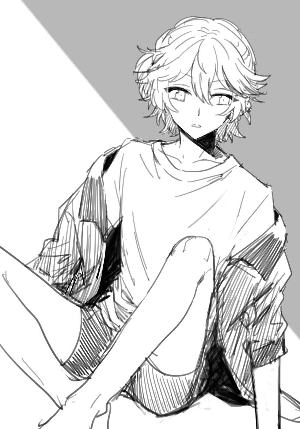 1boy against_wall dankira!!! facing_viewer highres hinata_mahiru jacket looking_to_the_side male_focus monochrome open_mouth parted_lips shirt short_hair shorts sitting sketch solo trap yukinotihare
